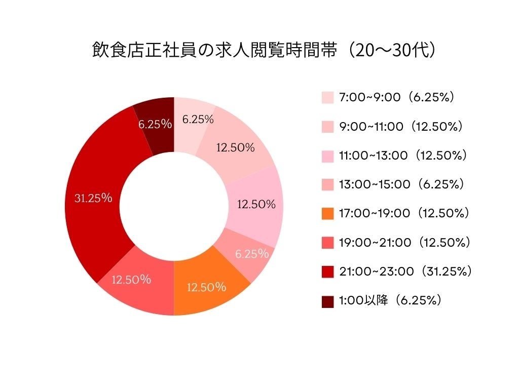 「求人閲覧が21:00〜23:00に最多」という結果は、他業種に勤務する方や、すでに飲食業を辞めている経験者たちが“夜のくつろぎ時間”に求人をチェックしている可能性が高いと考えられます。