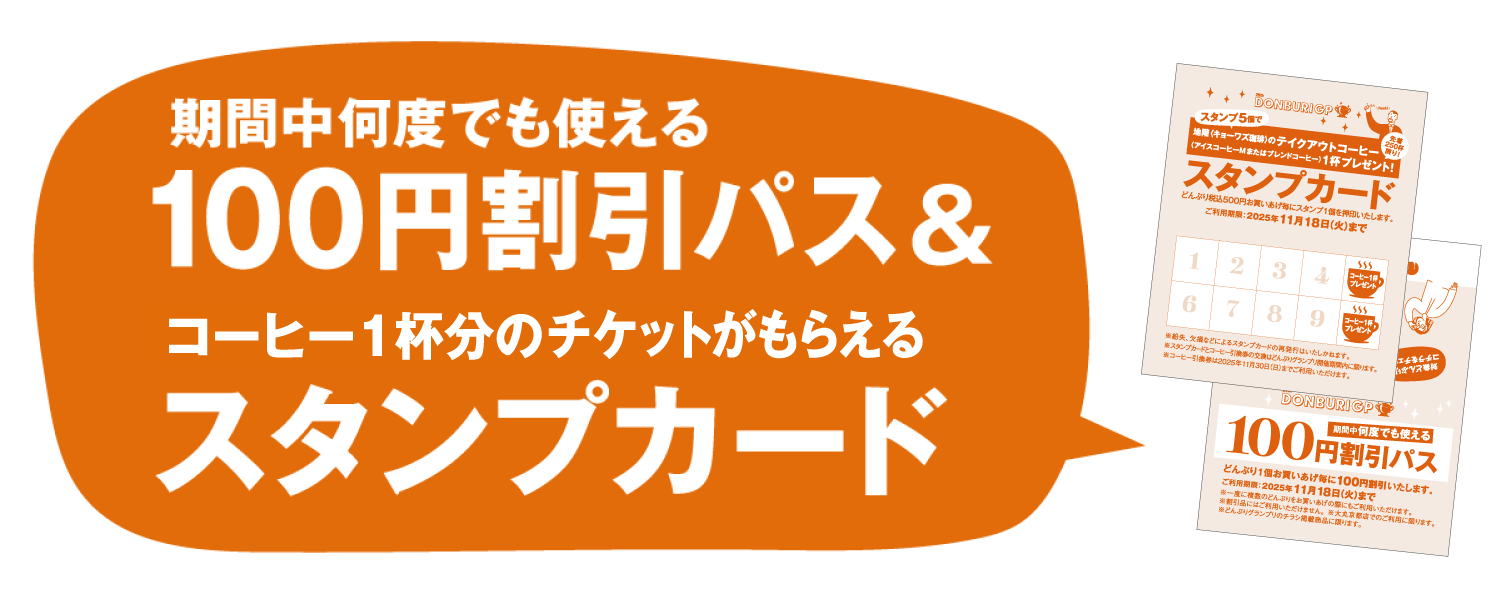 期間中どんぶりをお買いあげいただくと、次回から使える100円割引パス&スタンプカード1枚をお渡しします。2回目以降のお買いあげ時にパスを見せるだけでどんぶり1個につき100円割引いたします。また裏面のスタンプカードには、お買いあげ金額税込500円毎にスタンプ1個を押印(初回お買いあげのスタンプも押印)。スタンプ5個で地階キョーワズ珈琲でご利用いただける「テイクアウトコーヒー引換券(アイスコーヒーMまたはブレンドコーヒー)」1枚を先着250杯分プレゼントします。