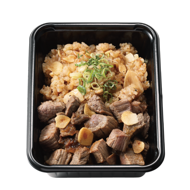 牛肉の旨みをたっぷり染み込ませたガーリックライスに特製ステーキソースをからめたサイコロステーキをのせて。