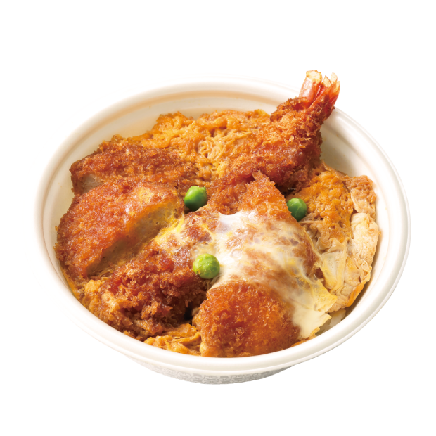 〈まい泉〉自慢のヒレかつとエビフライ、イカフライを特製のたれで卵とじに。