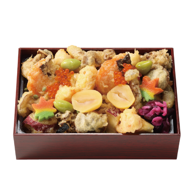 えび、きす、ちくわの磯辺揚げ、ごぼうなど8種の天ぷらをのせ、のり弁風に。