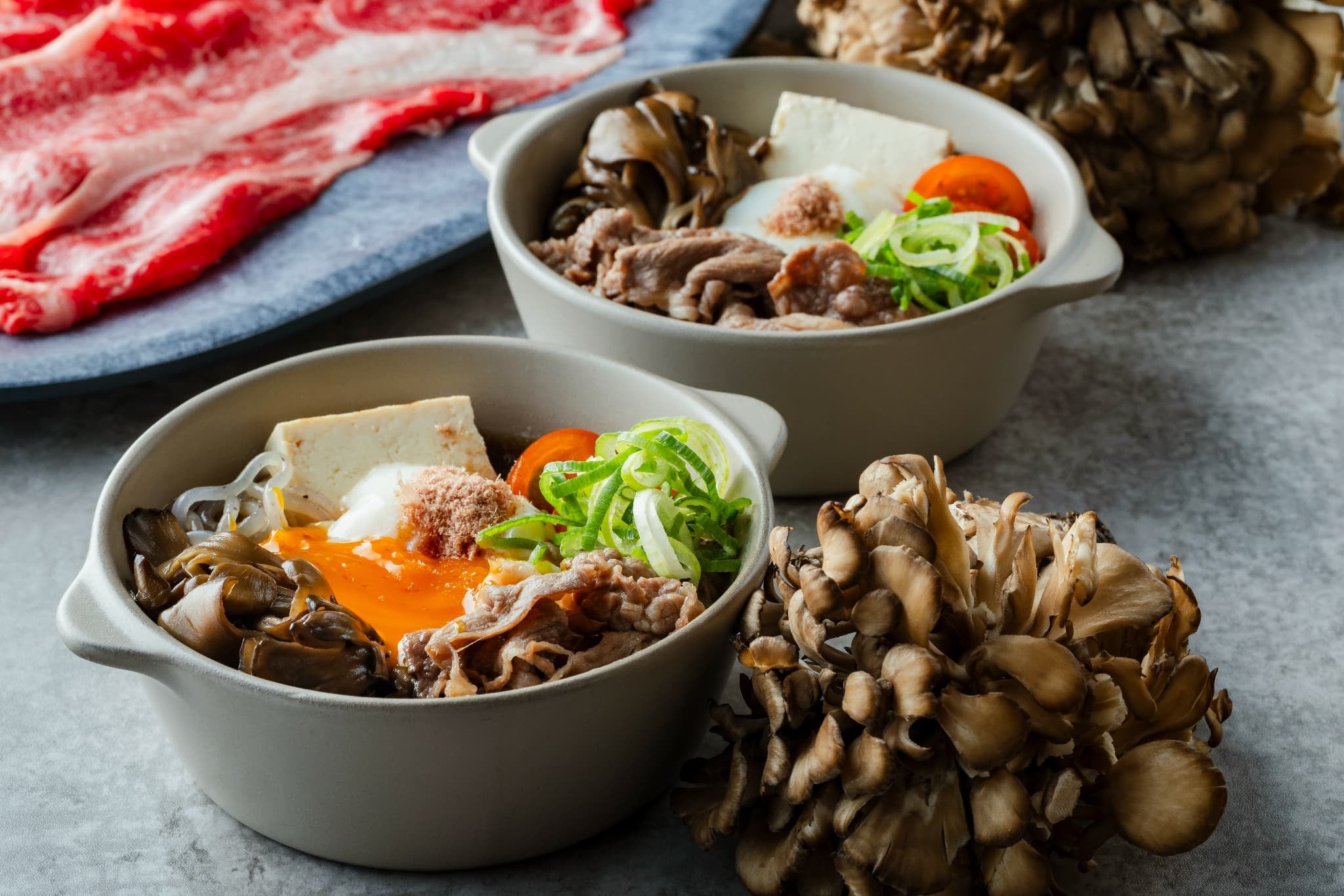 甘辛く炊いた和牛や広島県廿日市市で栽培される「女鹿平(めがひら)舞茸」を、広島県世羅町で飼育された「純国産鶏もみじ」の卵を絡めてお召し上がりいただくすき焼きです。広島風お好み焼きでお馴染みの「魚粉」を使用することで、旨みを引き出しました。