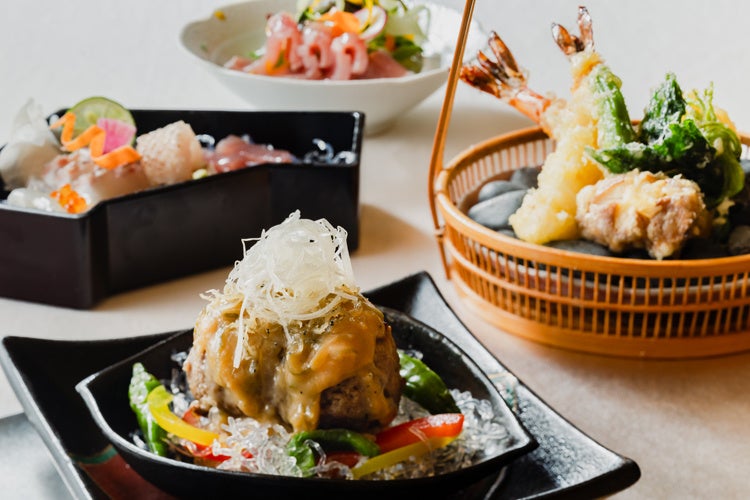 牛肉の肩バラ肉「コウネ」のハンバーグに、音戸のちりめんと広島の味噌を合わせた和風ソースで味わいいただける一品や、広島レモン風味 叩き鮪のサラダ仕立て、広島県府中市上下町の四八米(しはちまい)など、広島らしさを詰め込んだ和の御膳です。