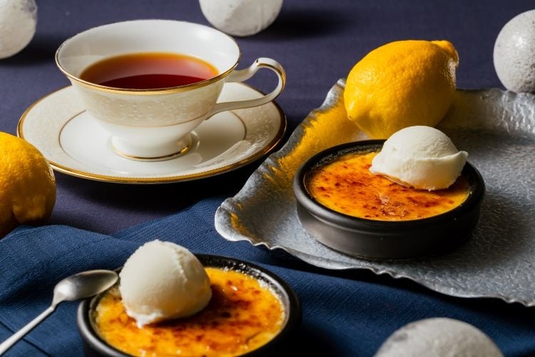 隔月で季節のおすすめ紅茶と、紅茶に合うスイーツをセットで提供。今回のスイーツは、パリッと香ばしいキャラメリゼの下になめらかで濃厚なクリームと「広島県産レモン」の爽やかな香りが広がるクリームブリュレをご提供します。