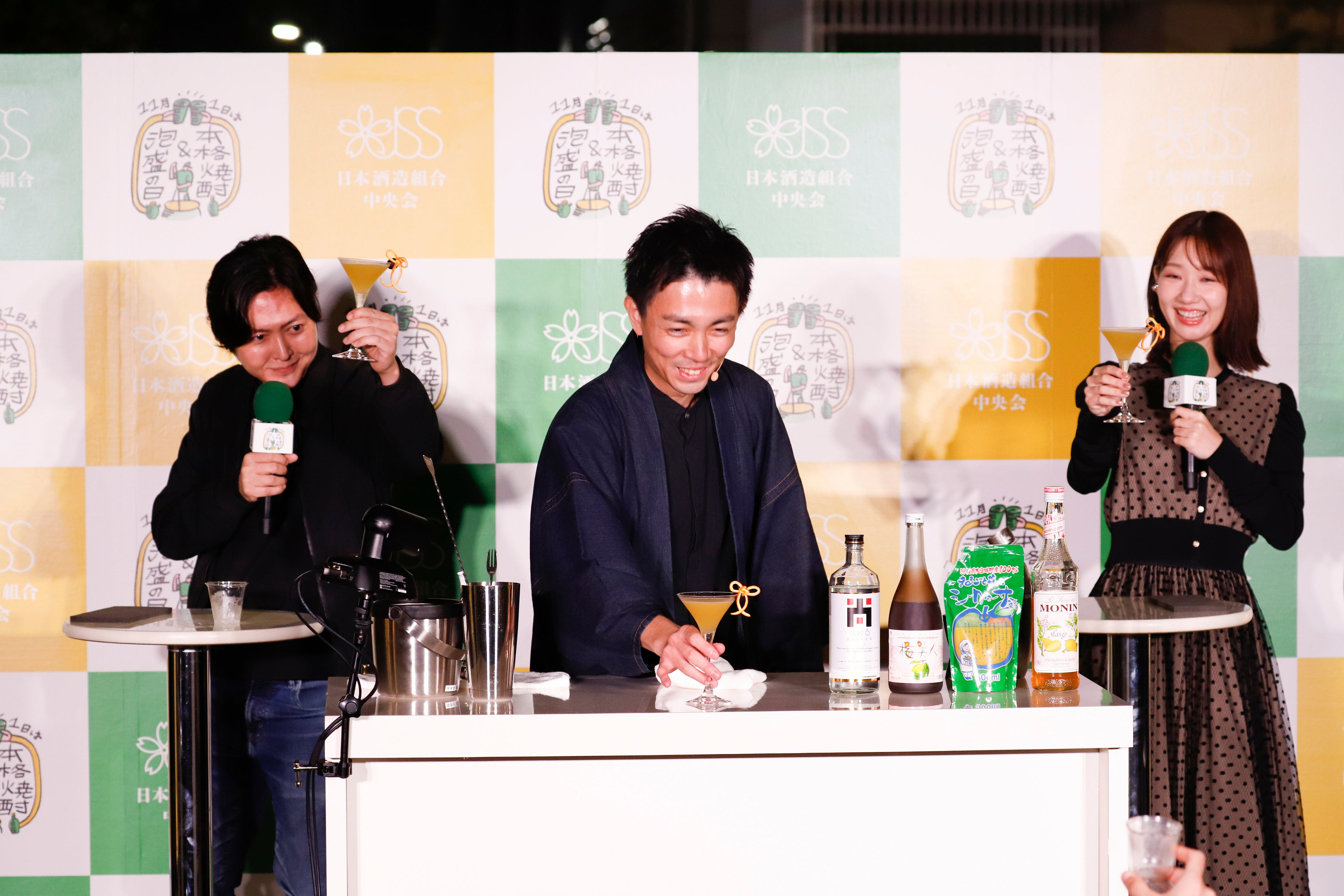 トークセッションの後には第7回本格焼酎&泡盛カクテルコンペティション優勝者の小池辰弥さんによる、泡盛をベースとした優勝カクテル「結(ゆい)ゆい」の披露とおうちでも気軽に楽しめる芋焼酎ベースのカクテルの実演を行いました。「結(ゆい)ゆい」を試飲した柏木さんは「見た目が綺麗!シークサワーとマンゴーと梅の果実感、バランスが絶妙です!」とコメント。またリュウジさんも「調和がすごい。泡盛のイメージが変わるぐらい美味しいです」と語り、お二人とも満足げな表情が印象的でした。