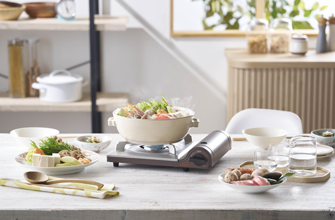 マットな質感と空間に溶け込むデザインが人気のカセットこんろです。テーブル面からごとくまでの高さが74mmと薄型のため、お鍋の中身が見やすく、取り分けも簡単。冬のお鍋など、家族団らんの食卓で活躍します。