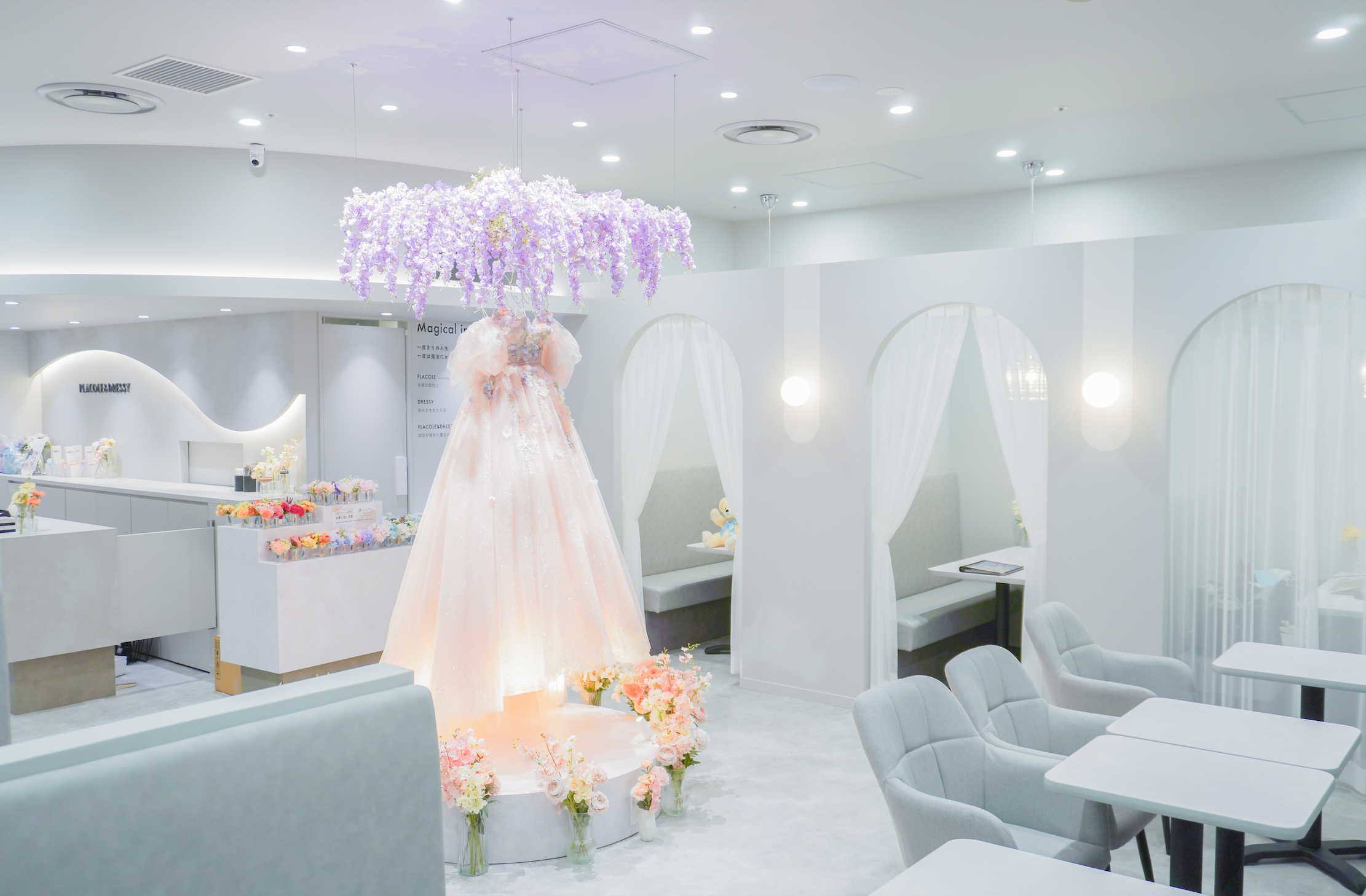 メニューには、美と健康を意識したエディブルフラワーがのった鮮やかなアサイーボウルや、名物のクロッフルを始め、写真映えもするクロッフルプレートなどの人気メニューが大阪でも展開されます。 ドリンクはオリジナルドレスアップティーを使用したティーカクテルやミルクティー、フレッシュなフラッペなど。また、24種類のオリジナルドレスアップティーを存分に楽しめるティーハーブティープランもレギュラーメニューに。ティーハーブティープランはミニ花瓶を飾りながらお好きな紅茶をお楽しみいただけます。 華やかなドレスとお花に囲まれた幻想的な空間で、特別な時間をお届けする『DRESSY CAFE』。 美しさとときめきが詰まった魔法の空間をぜひ体験してください。