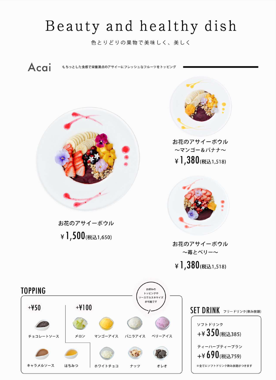 DRESSY CAFEで大人気のお花のアサイーボウル。栄養豊富なアサイーをベースに、ビタミン・ミネラルなどの栄養を豊富に含んだ様々なフルーツをふんだんに使用し、色とりどりの果物で美味しく、美しく、美と健康を考えた1品です。また、DRESSY CAFEらしくエディブルフラワーがトッピングされ、