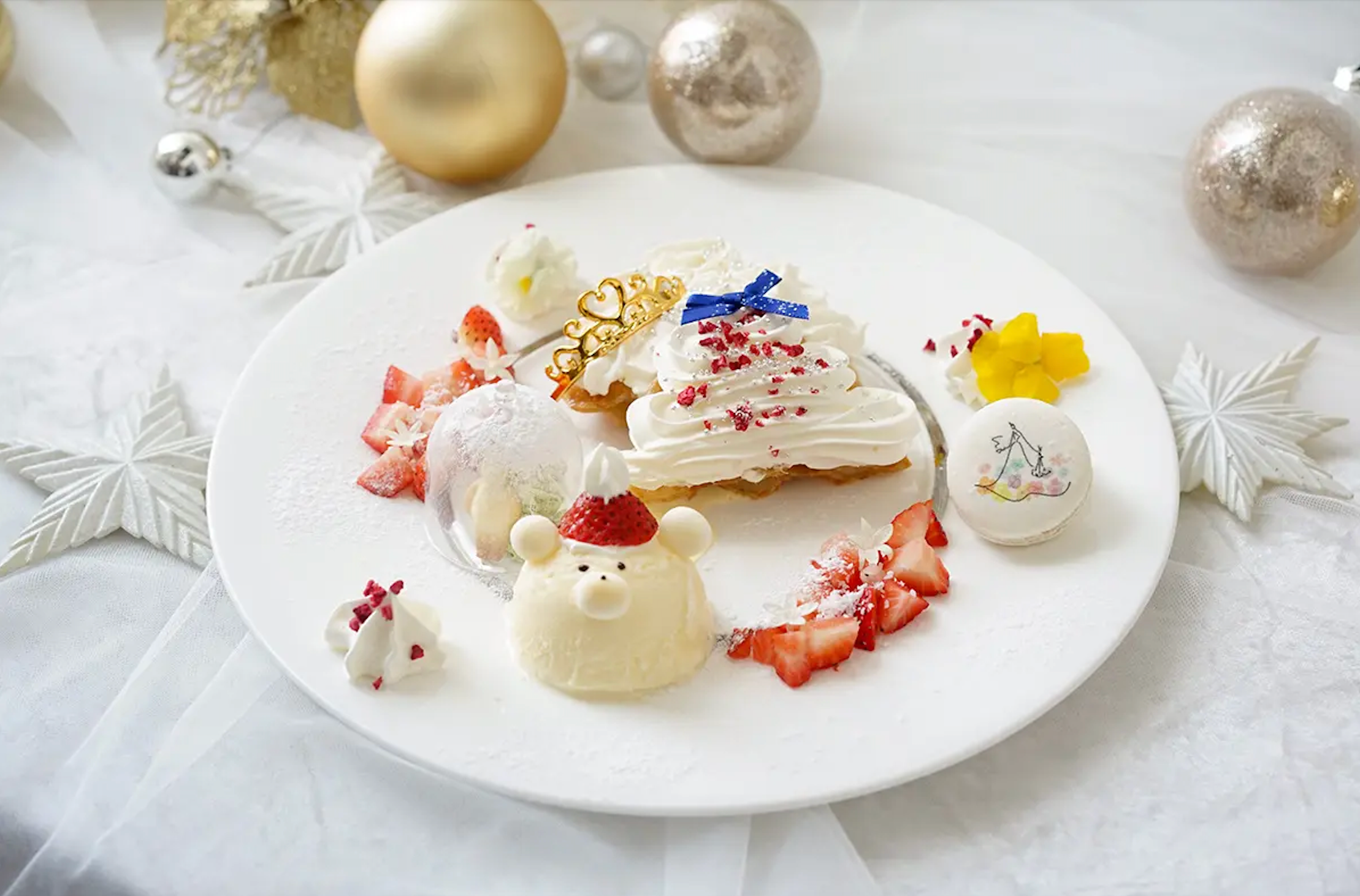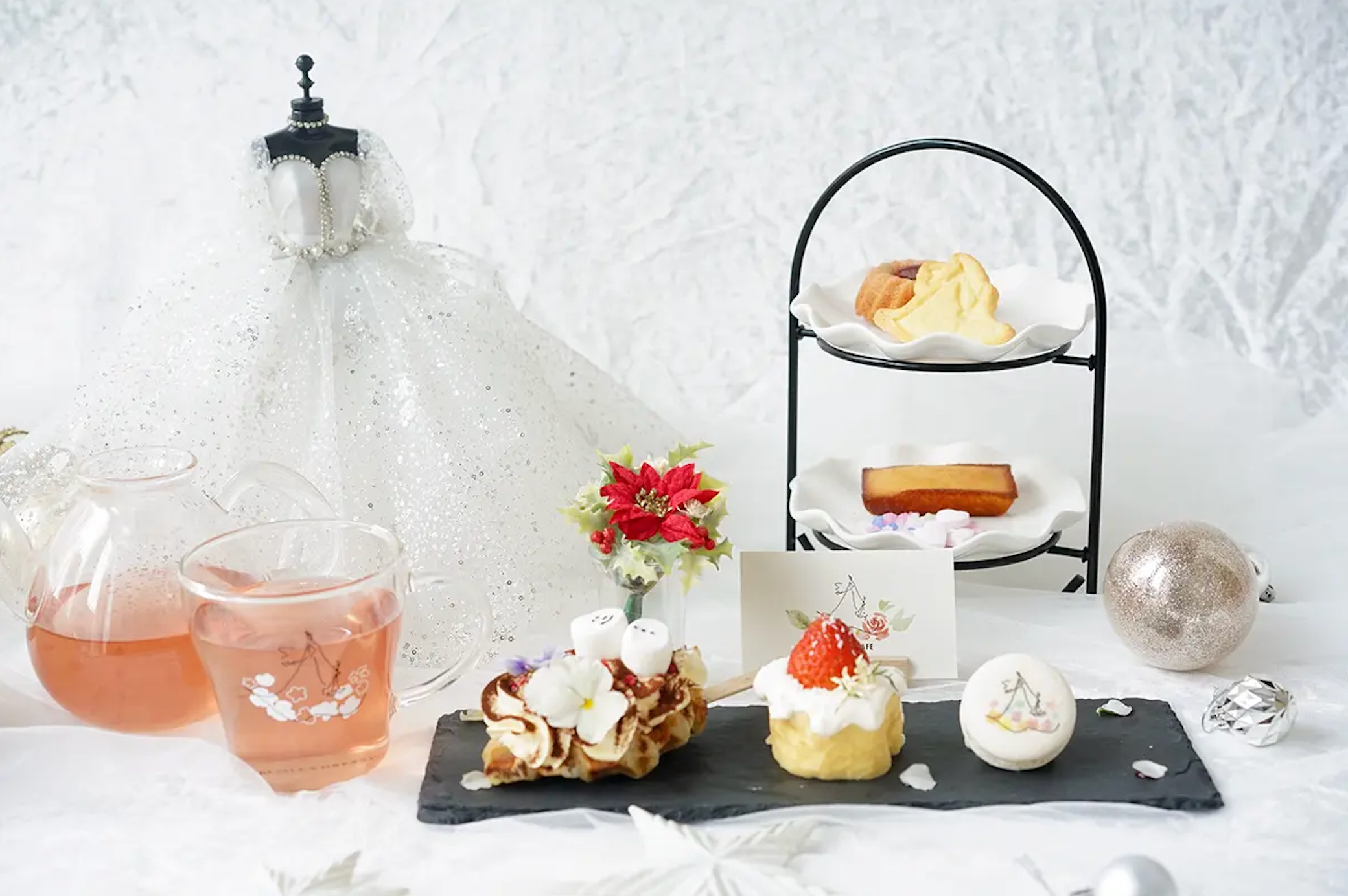 華やかなドレスを中心とした装飾を間近に感じられる店内で、優雅なひとときをお過ごしいただける『お花のアフタヌーンティーセット』をご用意。11月〜12月は期間限定、ホワイトクリスマスの世界感を存分に感じられるキュートなスイーツたちが並ぶ、シーズン限定のスペシャルなアフタヌーンティーです。コースには「DRESSY CAFE」オリジナルのオーロラウェルカムシャンパンや、「オリジナルドレスアップティー」の飲み放題もセットになっている豪華コースです。