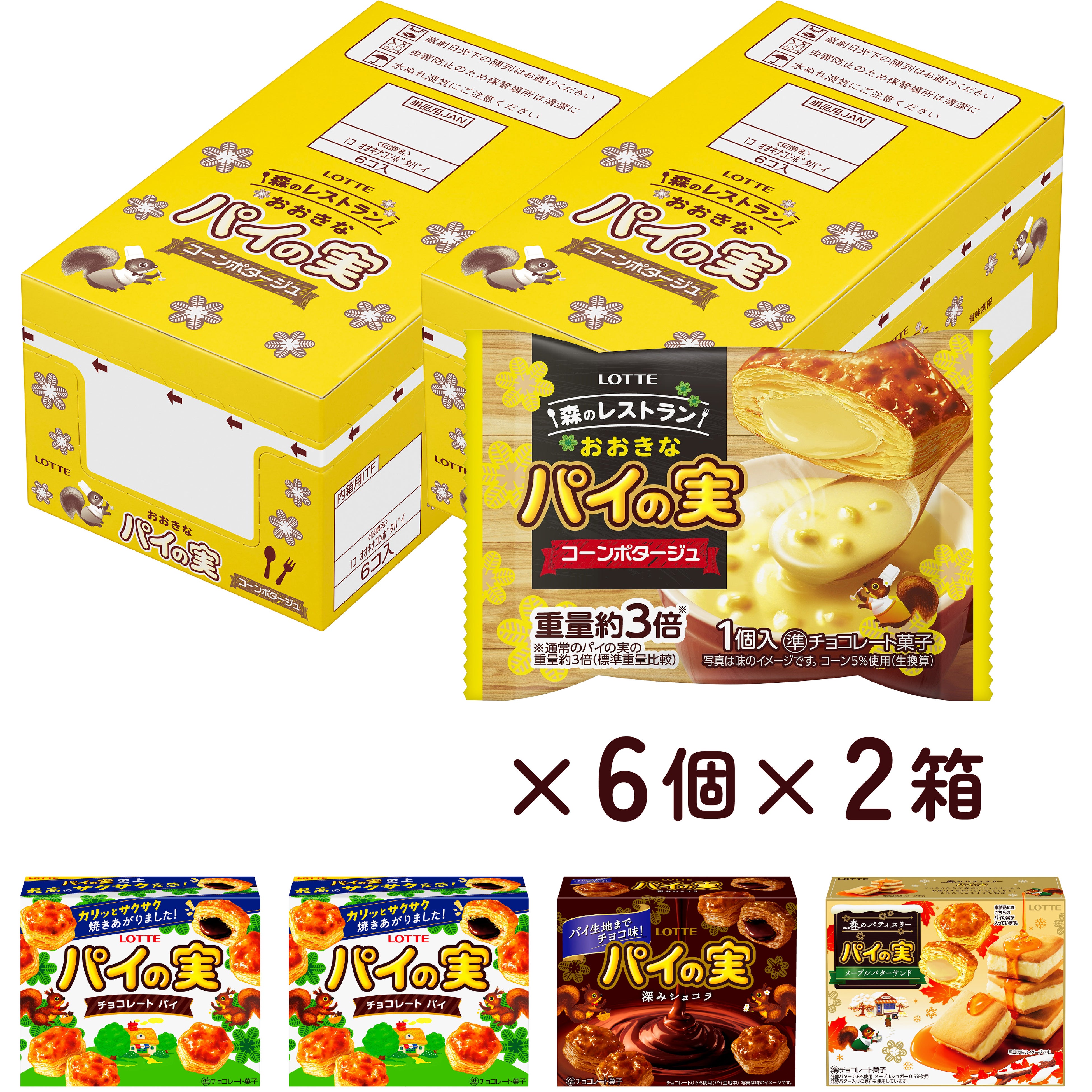 ・おおきなパイの実<コーンポタージュ>セット:6個×2箱 ・パイの実:2箱 ・チョコを味わうパイの実<深みショコラ>:1箱 ・パイの実<メープルバターサンド>:1箱 |