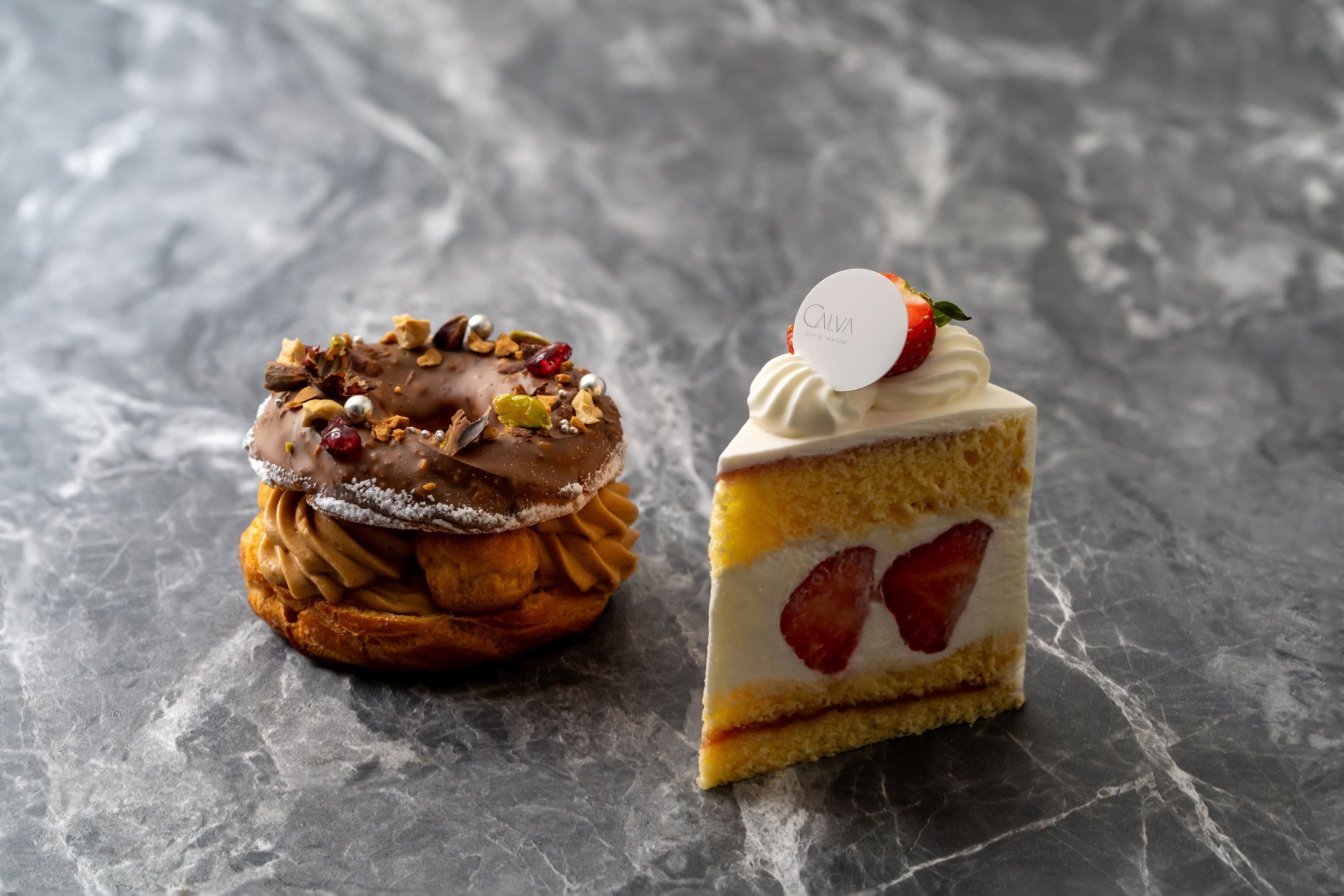 こだわりのショートケーキと、焙煎したヘーゼルナッツをキャラメリゼしたプラリネをクレームムースリーヌに加え、サクッと焼き上げたシュー生地に絞ったパリブレストのセット。