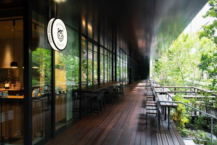 この度開業した『TORANOMON MARCHÉ』は、赤坂・虎ノ門緑道至近の1階オープンテラスに位置しています。新業態5店舗、東京初出店2店舗を含む個性豊かな11店舗が集結し、共用席、専用席、テラス席を合わせて昼は263席、夜は306席をご用意しております。