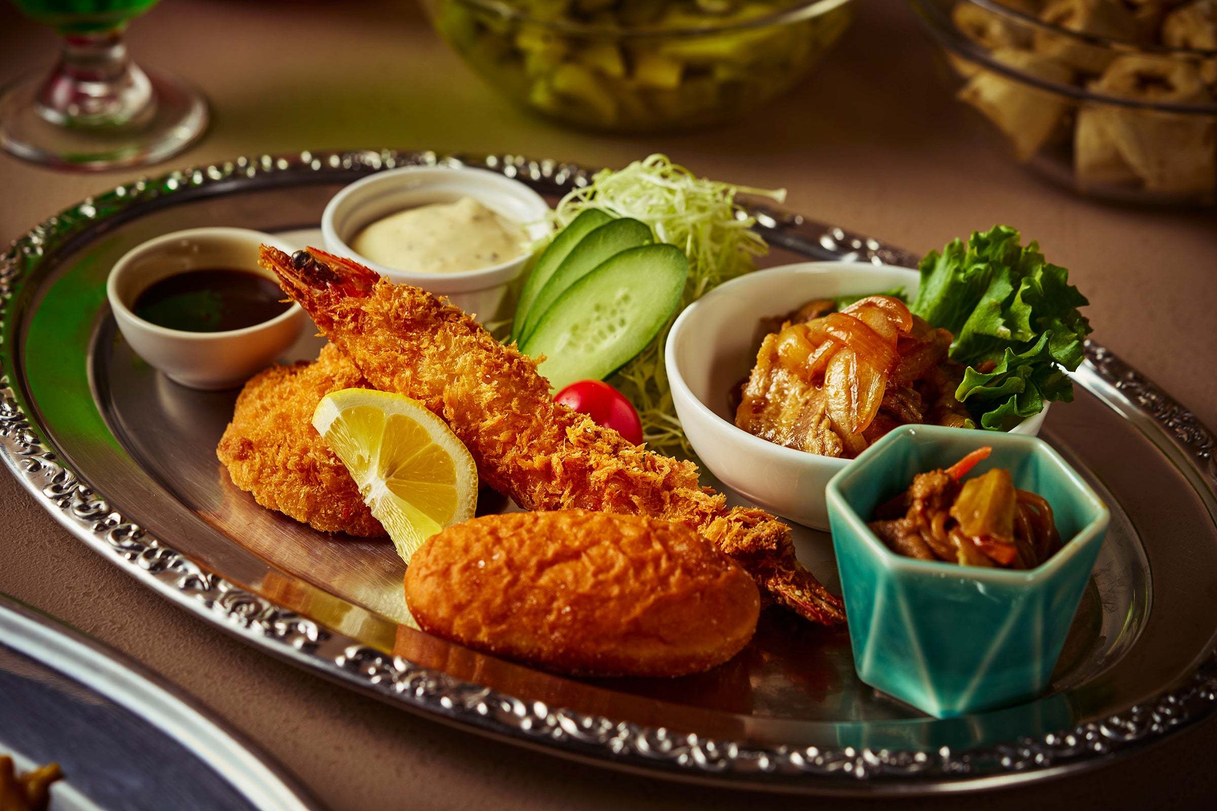 昭和の食卓を彩った定番メニューを、ホテルならではの贅沢なスタイルで再現。香ばしい豚の生姜焼きに、サクサクのエビフライとハムカツ、懐かしの学校給食の定番でもある揚げパンを添えた、満足感たっぷりの一皿です。
