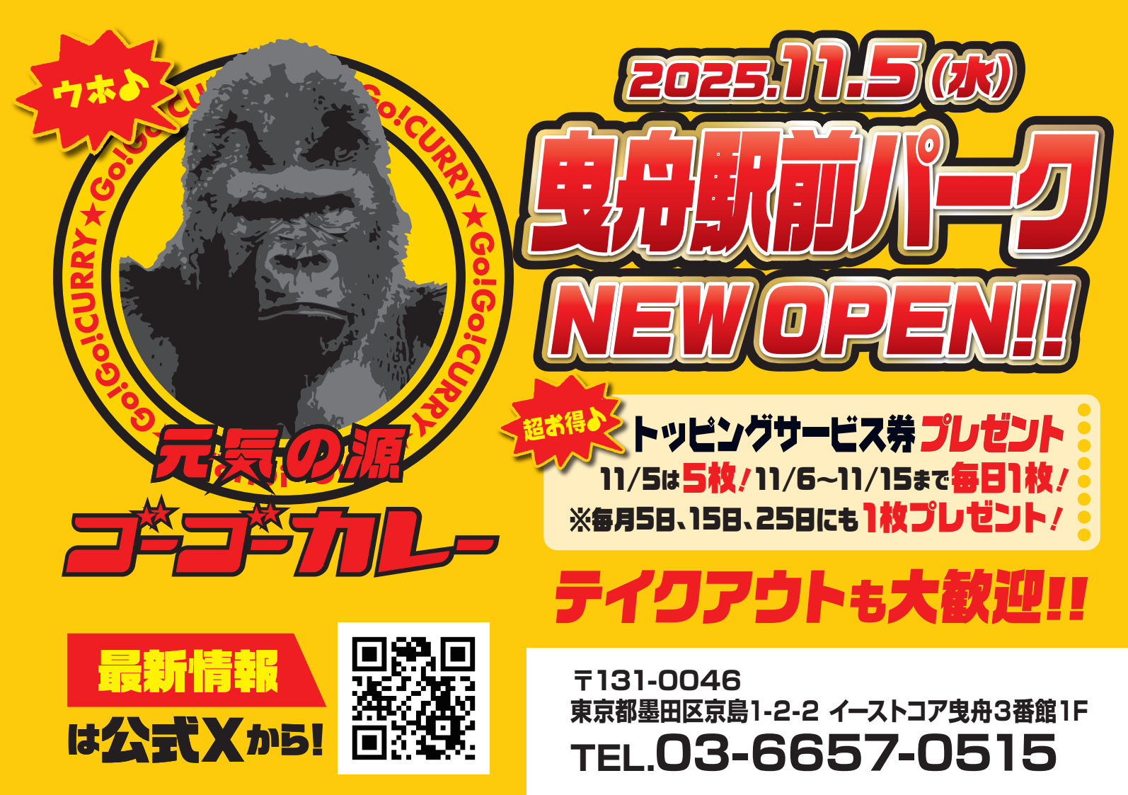株式会社ゴーゴーカレーグループ(本社:石川県金沢市、CEO兼代表取締役社⻑:⻄畑誠、以下 ゴーゴーカレー)は、2025年11月5日にゴーゴカレー曳舟駅前パークをオープンします。