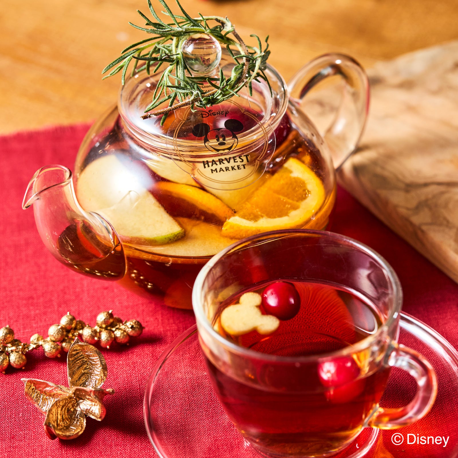 ハーベストブレンドティーにカラフルフルーツのマリネを合わせました。ミッキー型のリンゴがキュートなフルーティーで優しい甘さの紅茶です。