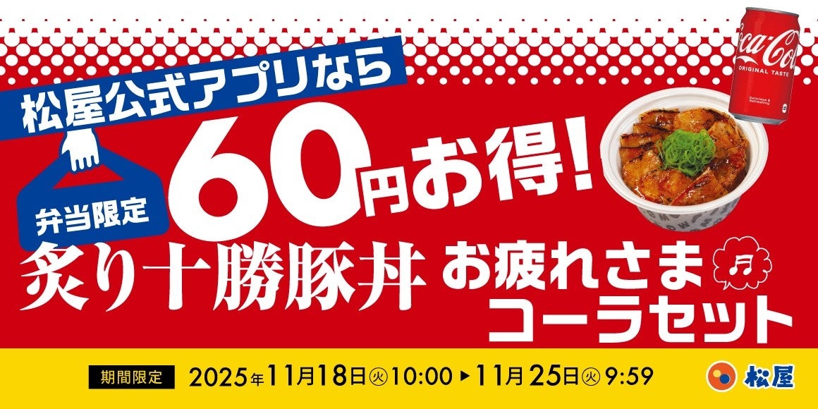 さらに、日頃頑張っている皆さまを応援する期間限定企画として、アプリ注文クーポンに「お疲れさまコーラセット」をご用意いたします。人気メニューの「炙り十勝豚丼弁当各種」と「コカ・コーラ」をセットでご購入いただくと、通常価格より60円引きでお得にお楽しみいただけます。