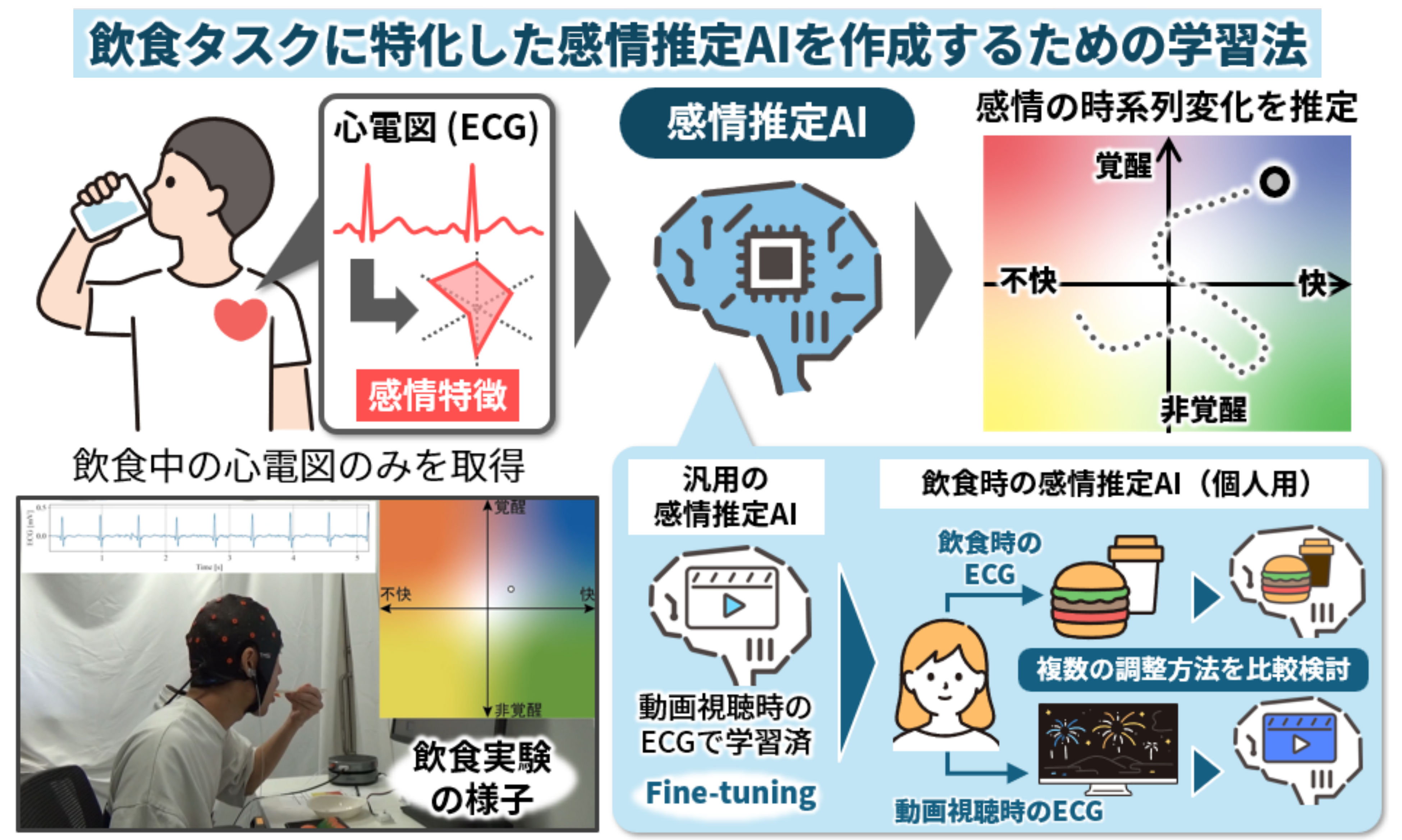 従来、生体信号による感情推定研究は、動画視聴や音楽鑑賞など、感情が大きく変化する事象にて実施されており、食事のような日常的な動作での感情変化の推定は困難とされていました。今回、飲食時における感情変化を生体信号から高精度で推定できるAIモデルの構築を試みており、その成果の一部を発表しました。本研究では、ウェアラブルセンサーなどを用いて簡便に計測可能な心電図などの情報を用い、リアルタイムに感情を推定することが可能な方法論を提案しています。