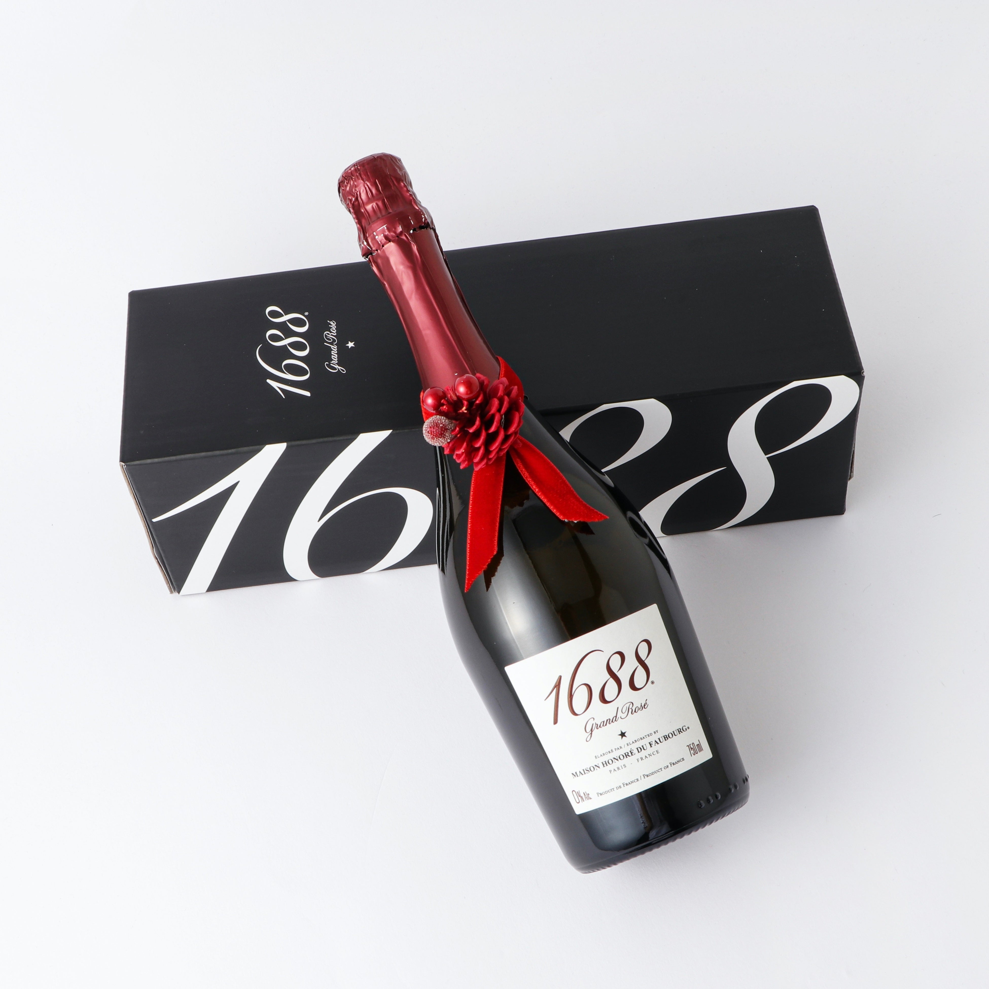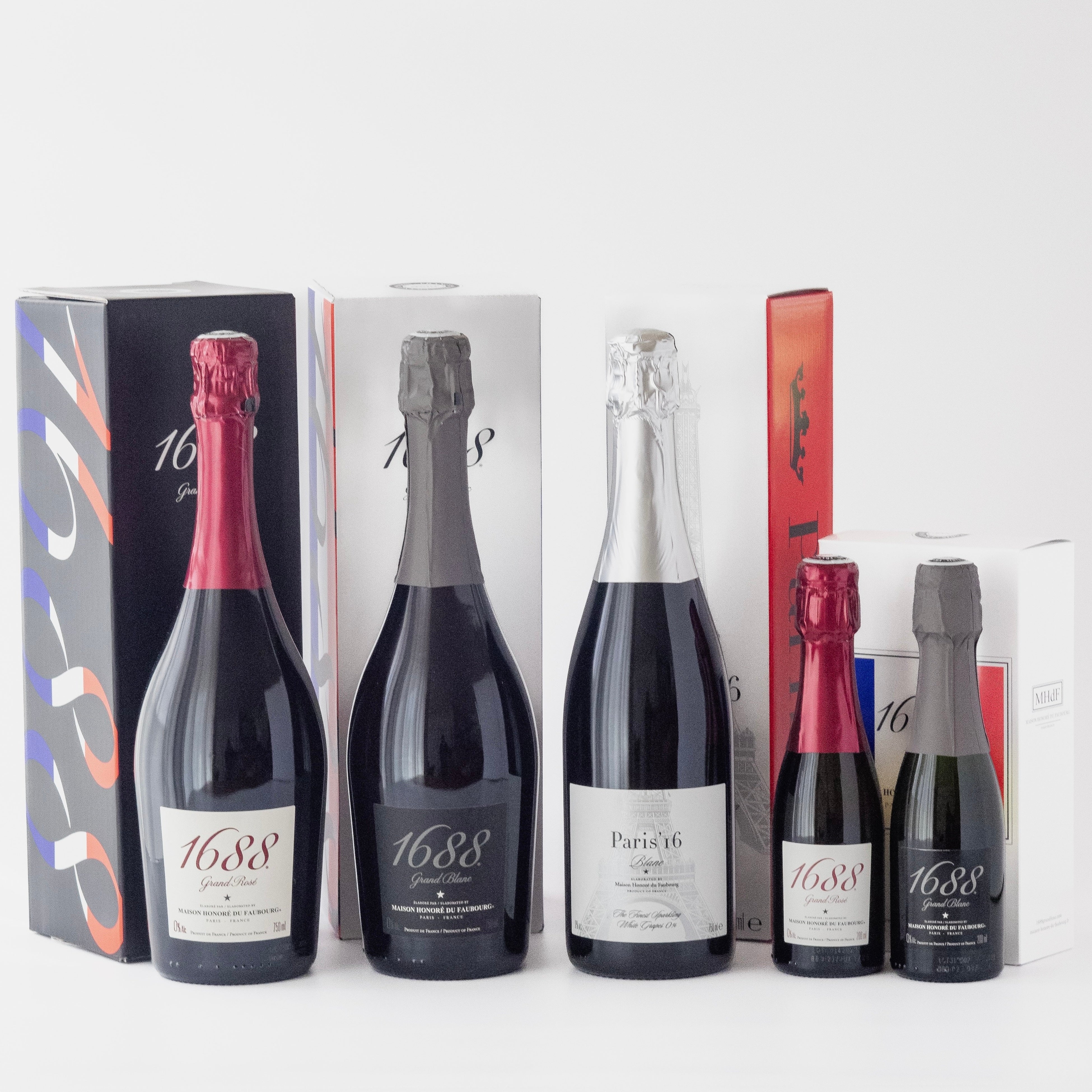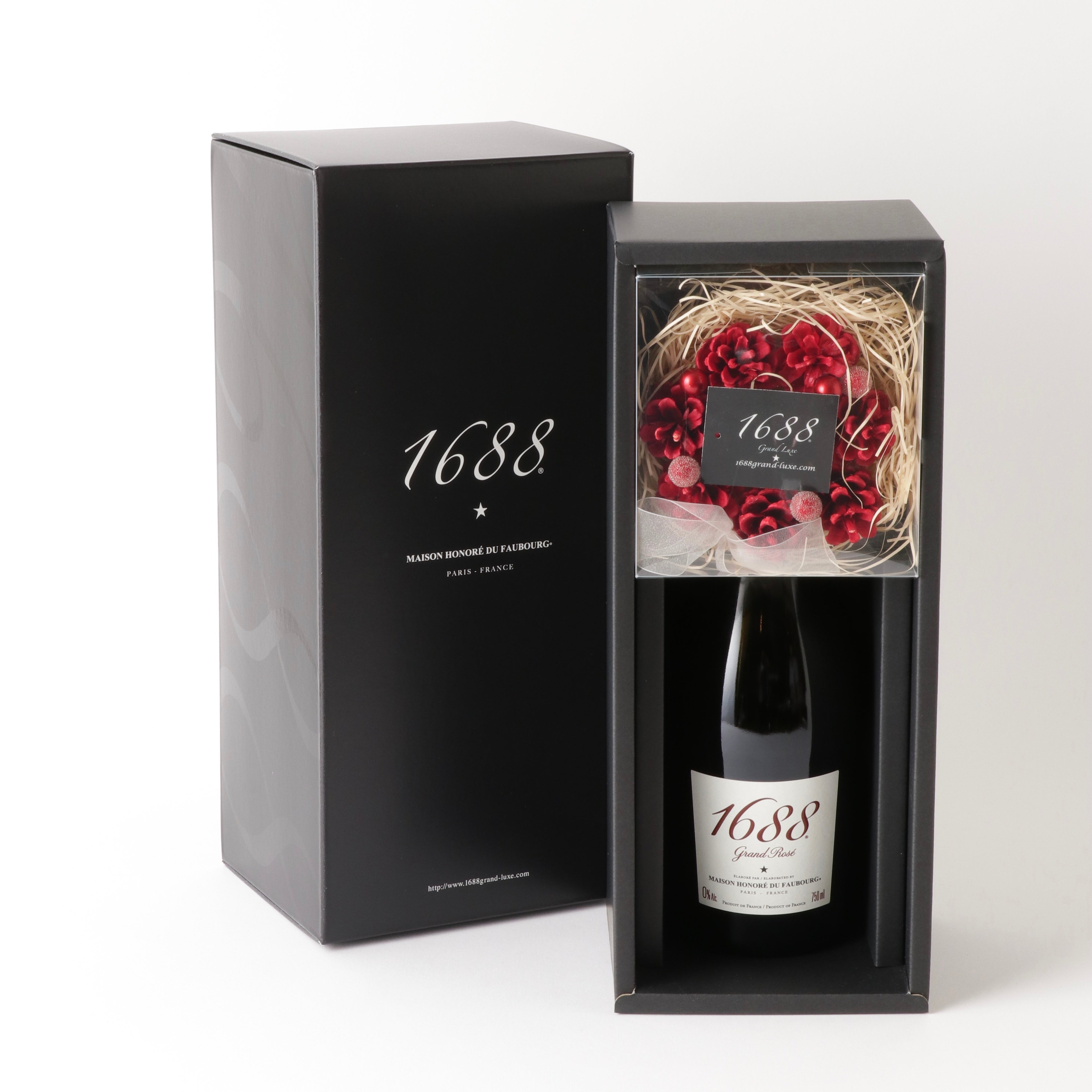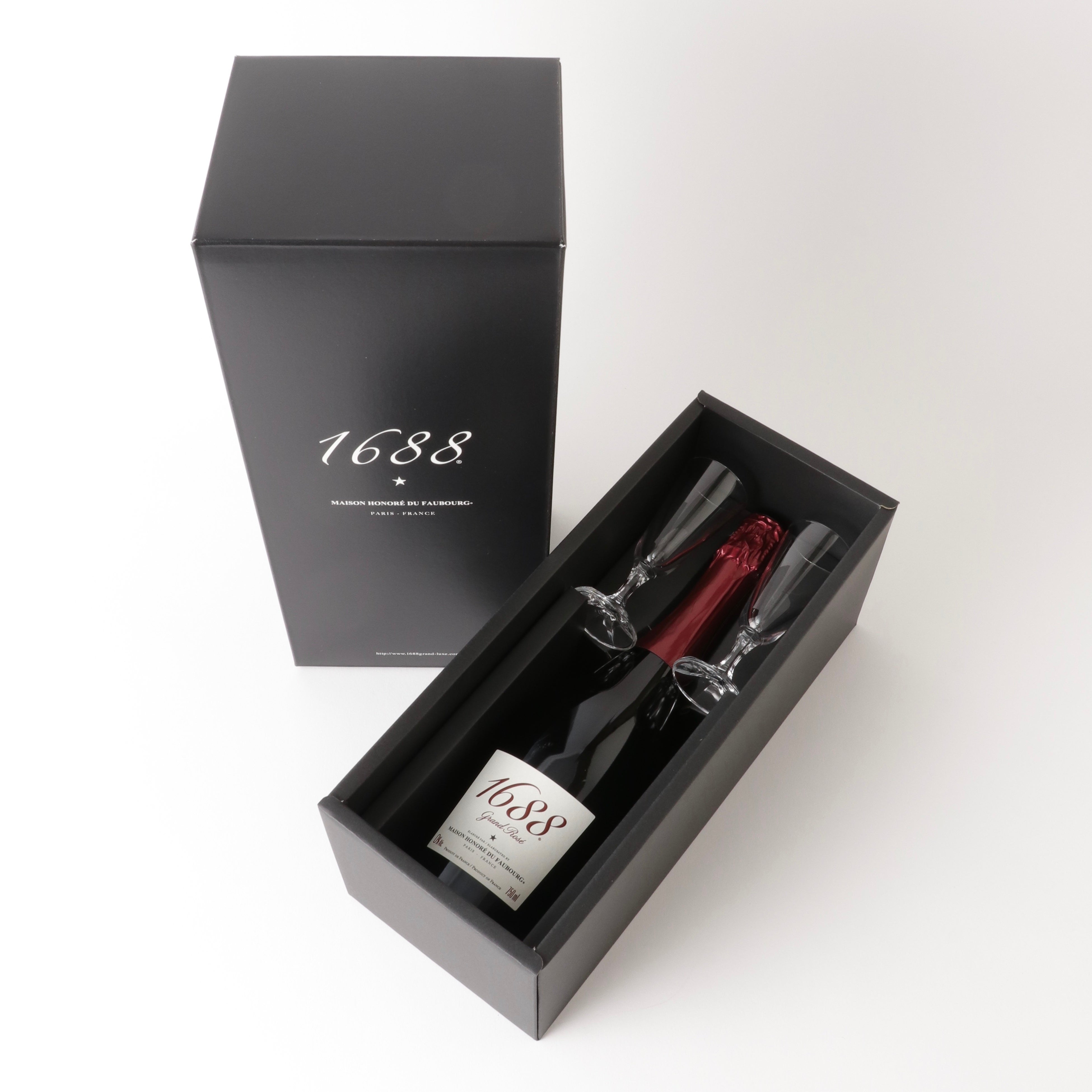『1688 Grand Rosé』『1688 Grand Blanc』『Paris’16 Blanc』の単品は、それぞれ重厚感のある化粧箱入りです。また、クリスタルグラスとのセット商品なども取り揃えており、ブランドマーク入りの手提げ袋などのご用意もございます。
