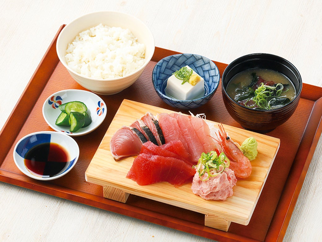 お刺身盛り合せ、ごはん、味噌汁、漬物、小鉢が付いたオトクな定食です。昼でも夜でも、1人飲みでも大満足!