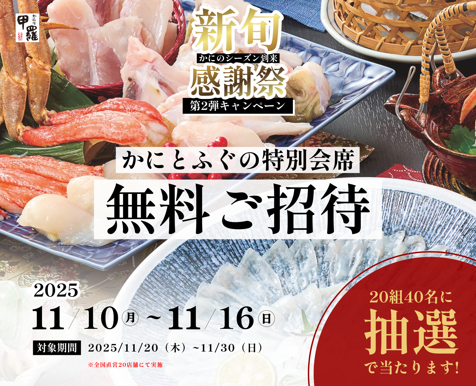 株式会社甲羅(本社:愛知県豊橋市、代表取締役社長:沼澤 裕)が、全国39店舗で展開するかに料理専門店「甲羅本店」では、2025年10月23日(木)より「新“旬”感謝祭」を開催中です。