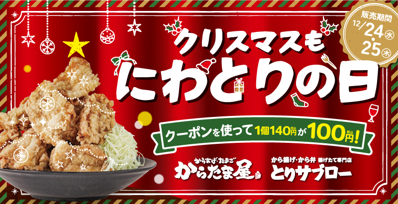 株式会社魁力屋が運営する持ち帰りから揚げ専門店「からたま屋」「とりサブロー」にて、2025年12月24日(水)・25日(木)でご使用いただけるクーポンを配布中です!