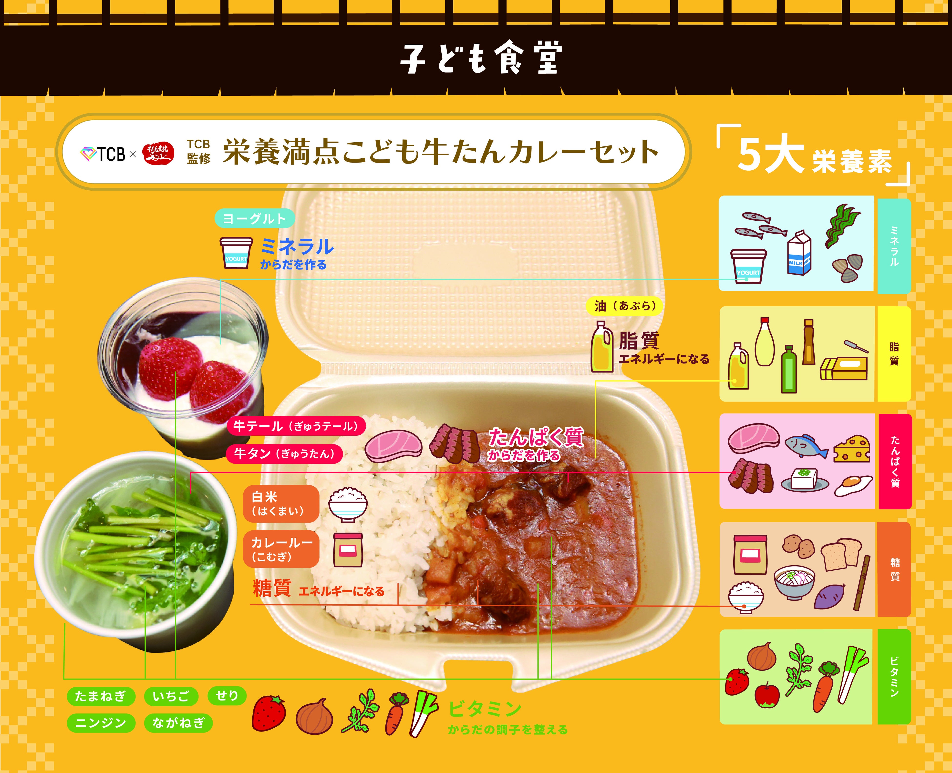 子どもの成長には、たんぱく質、糖質、脂質、ビタミン、ミネラルといった5大栄養素をバランス良く摂取することが重要です。今回の特別メニュー開発においては子どもたちの健やかな成長を願い、TCBドクター監修のもと栄養バランスにも重点を置きました。
