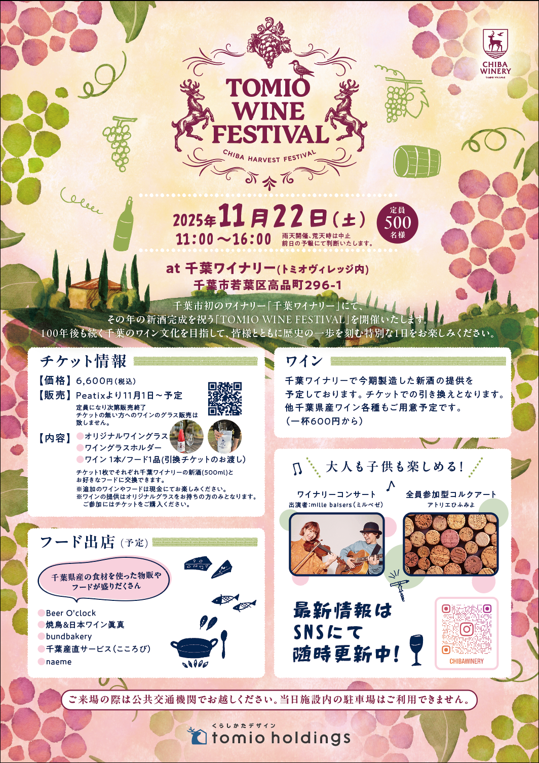2025年10月に誕生した千葉市初のワイナリー「千葉ワイナリー」(運営:株式会社トミオホールディングス 代表取締役社長 大澤成行)は、初醸造を記念し、2025年11月22日(土)に、その年の新酒完成を祝う 『TOMIO WINE FESTIVAL(トミオ ワイン フェスティバル)』 を開催いたします。
