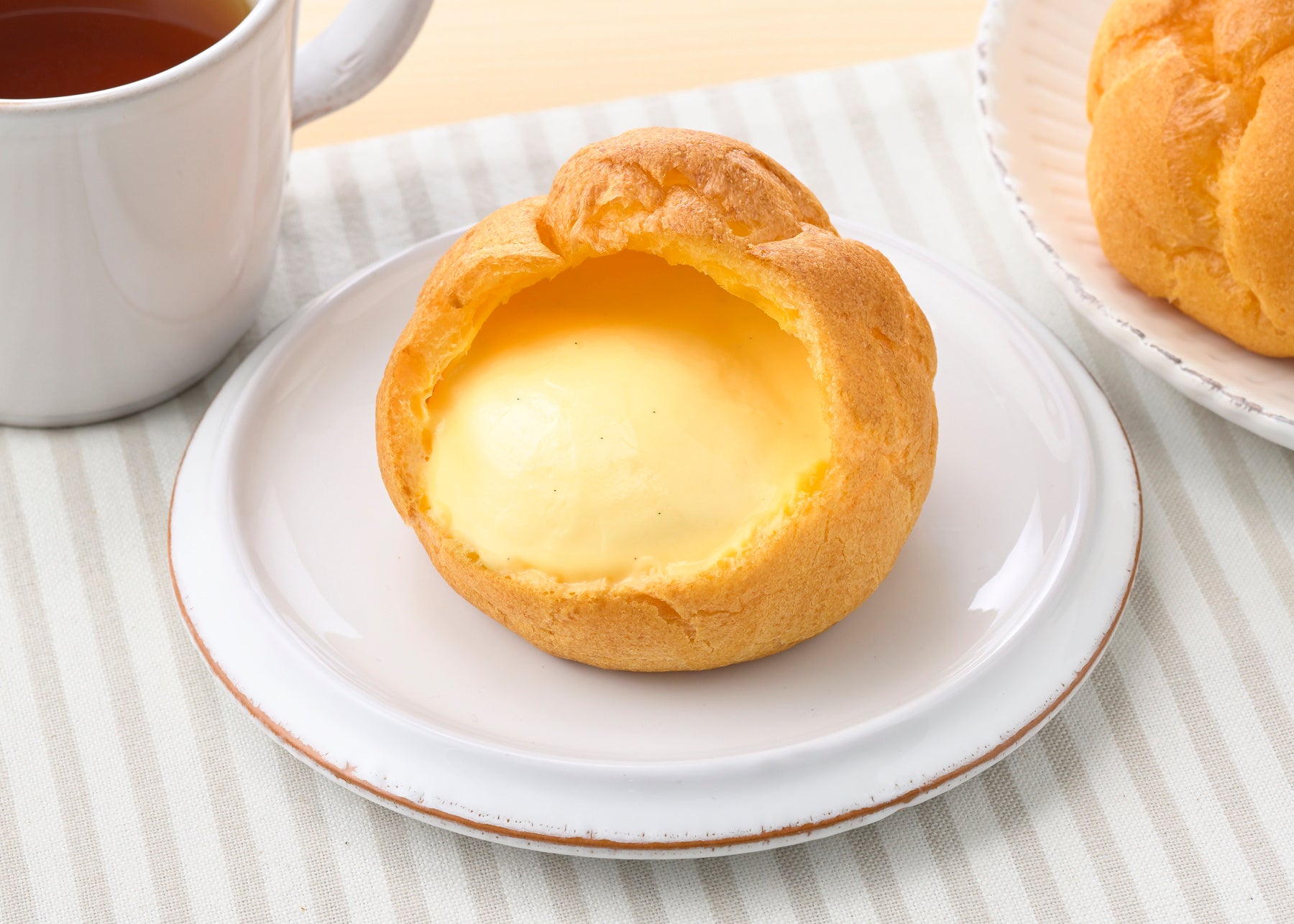 特長:ふんわりと丸く焼き上げたシュー皮に、卵のコクとミルク感を感じるカスタードクリームを詰めました。歯切れと口どけのよいシュー皮と、芳醇なマダガスカル産バニラの風味が広がる舌ざわりなめらかなカスタードが一体となって口どけてゆく食感をお楽しみください。