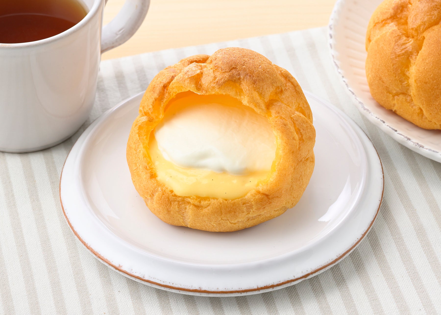 特長:ふんわりと丸く焼き上げたシュー皮に、卵のコクとミルク感を感じるカスタードクリームと、乳味豊かなホイップクリームを詰めました。芳醇なマダガスカル産バニラの風味が広がる舌ざわりなめらかなカスタードとホイップクリームの味わいのコントラストやバランスのよさを感じつつ、歯切れと口どけのよいシュー皮が一体となって口どけてゆく食感をお楽しみください。