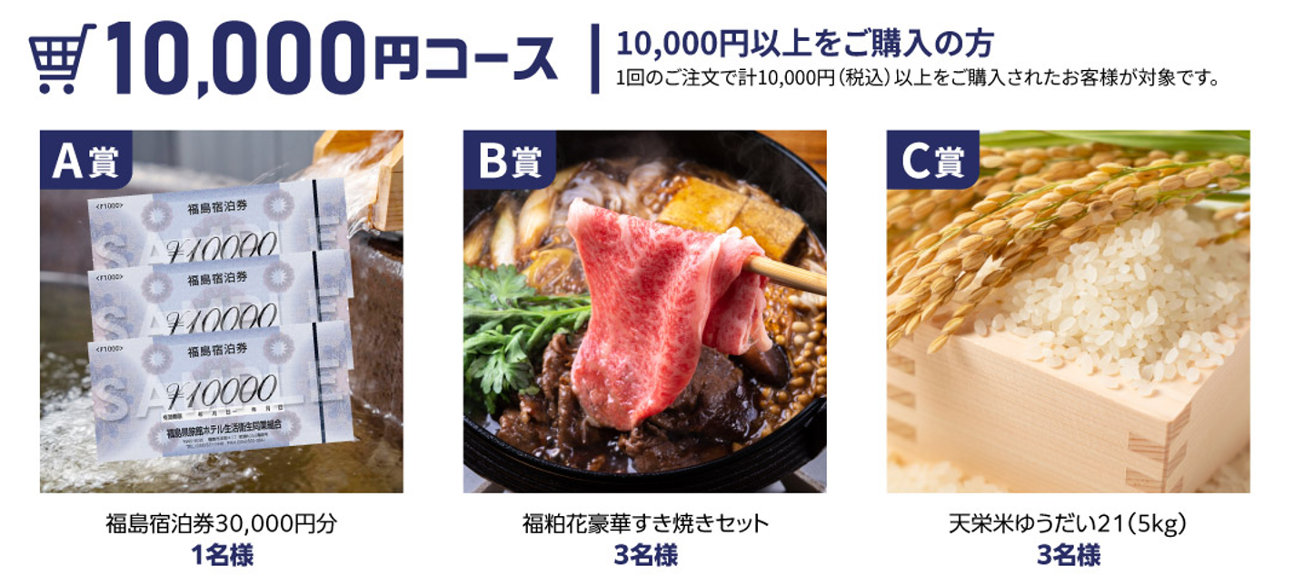 ふくしま市場で、キャンペーン期間中に一度のご購入が計3,000円/5,000円/10,000円以上の方に、当店よりお送りする該当コースの応募フォームからご応募ください。