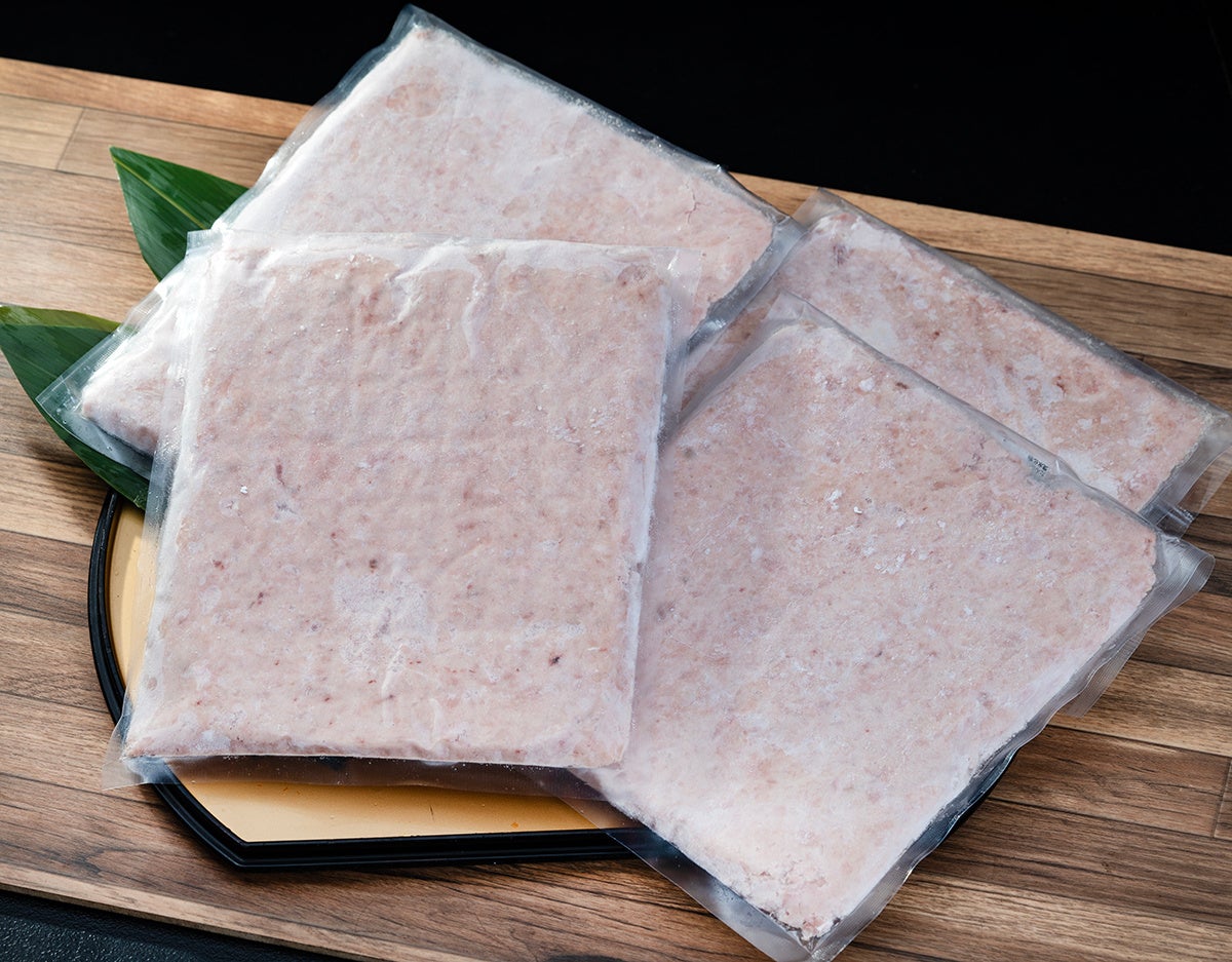 キハダマグロのさっぱりとした旨味と、メバチマグロの濃厚なコクを絶妙にブレンド。まぐろ本来の風味を楽しめるよう、調味料(アミノ酸等)や甘味料を使用していません。香りが豊かで、卵や薬味ネギ、豆板醤などとも好相性。ネギトロ丼、手巻き寿司はもちろん、マグロハンバーグなどアレンジも自在です。