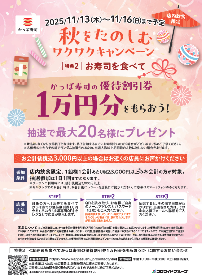 店内飲食限定で1組様1会計あたり税込3,000円以上のお会計の方を対象に、抽選で最大20名様に1万円分のかっぱ寿司の優待割引券をプレゼント