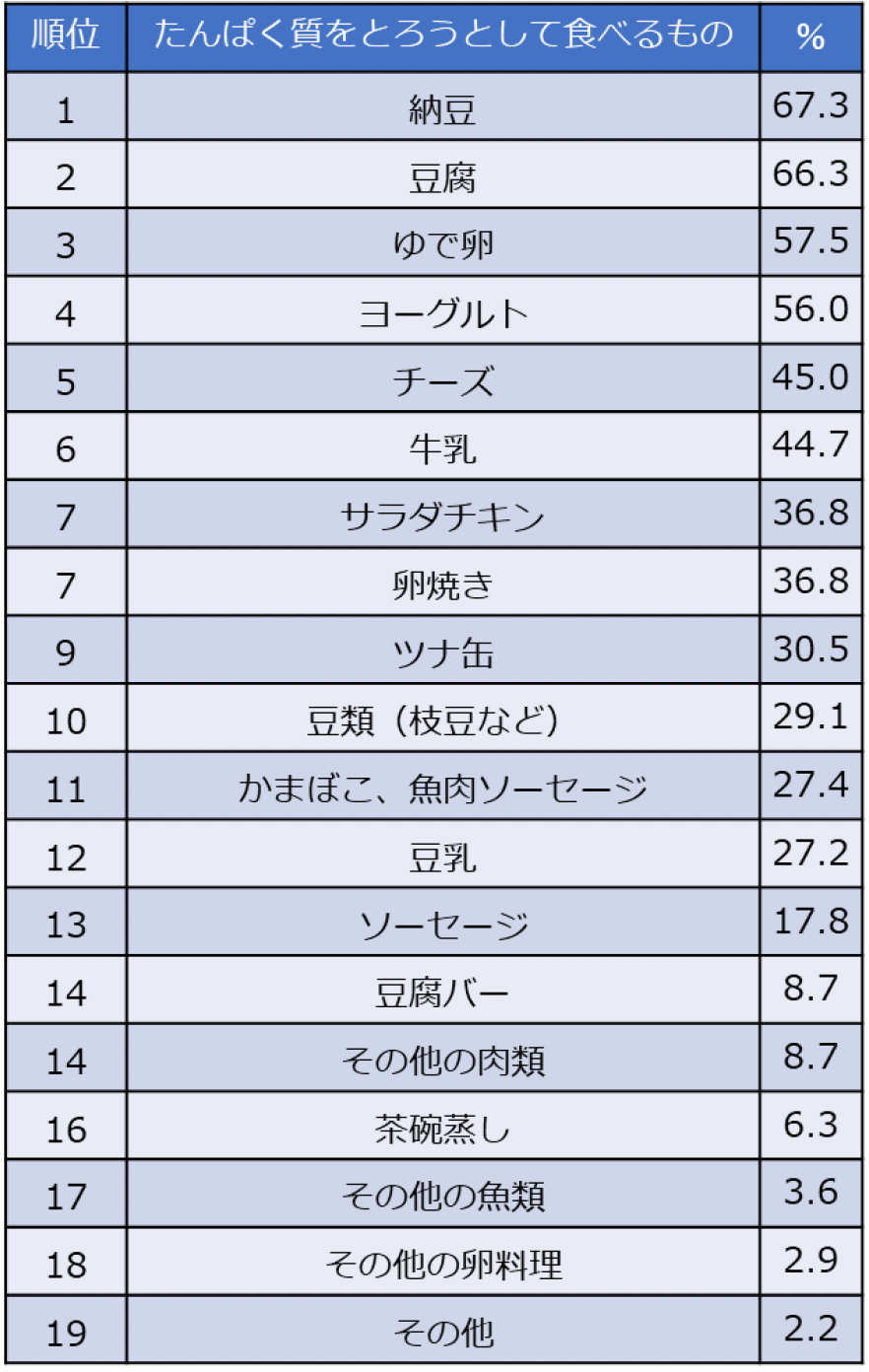 「意識的にたんぱく質をとるようにしている」人を対象に、「食事の中でたんぱく質をとろうとするとき、何を食べようと思いますか?」と聞いた質問では、「納豆」(67.3%)、「豆腐」(66.3%)といった大豆製品が1位・2位に輝きました。3位は「ゆで卵」(57.5%)で、4位~6位には「ヨーグルト」(56.0%)、「チーズ」(45.0%)、「牛乳」(44.7%)といった乳製品がランクインしました。大豆製品や卵、乳製品で日常生活の中に無理せずたんぱく質をとり入れている人が多そうです。