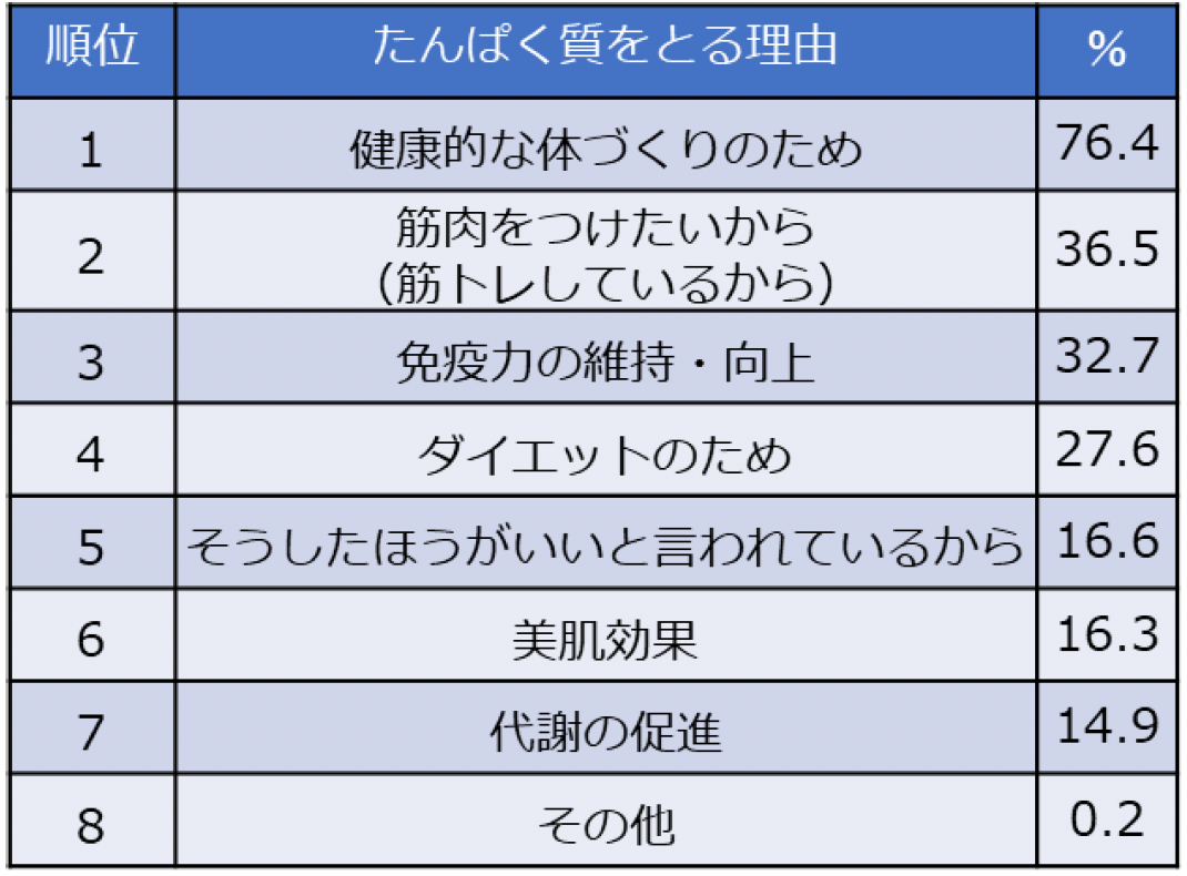 「意識的にたんぱく質をとるようにしている」人を対象に、「なぜたんぱく質をとろうと思いますか?」と聞いた質問では、「健康的な体づくりのため」が76.4%で圧倒的1位でした。2位以下には「筋肉をつけたいから(筋トレしているから)」(36.5%)、「免疫力の維持・向上」(32.7%)、「ダイエットのため」(27.6%)が続きましたが、何か特定の効果を求めるだけでなく、「たんぱく質は体に良い」という健康への意識が見られます。