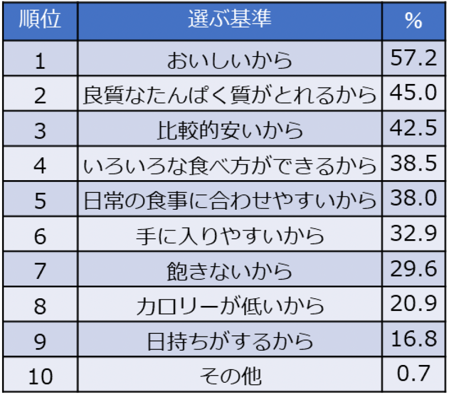 前問(「食事の中でたんぱく質をとろうとするとき、何を食べようと思いますか?」)に続き、「なぜそれを食べようと思いますか?」と聞いた質問では、「おいしいから」(57.2%)が最も多く、「良質なたんぱく質がとれるから」(45.0%)、「比較的安いから」(42.5%)が続きました。