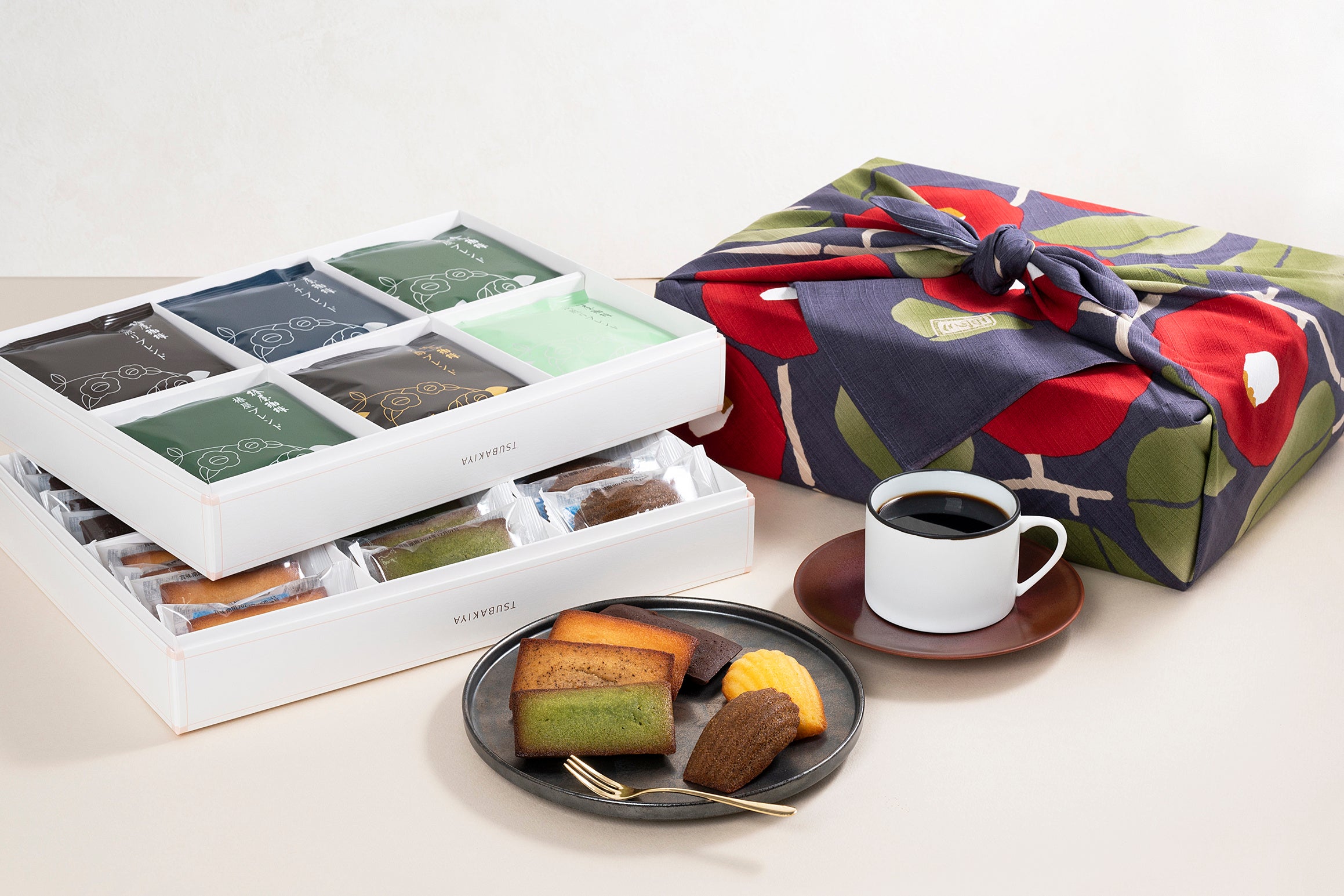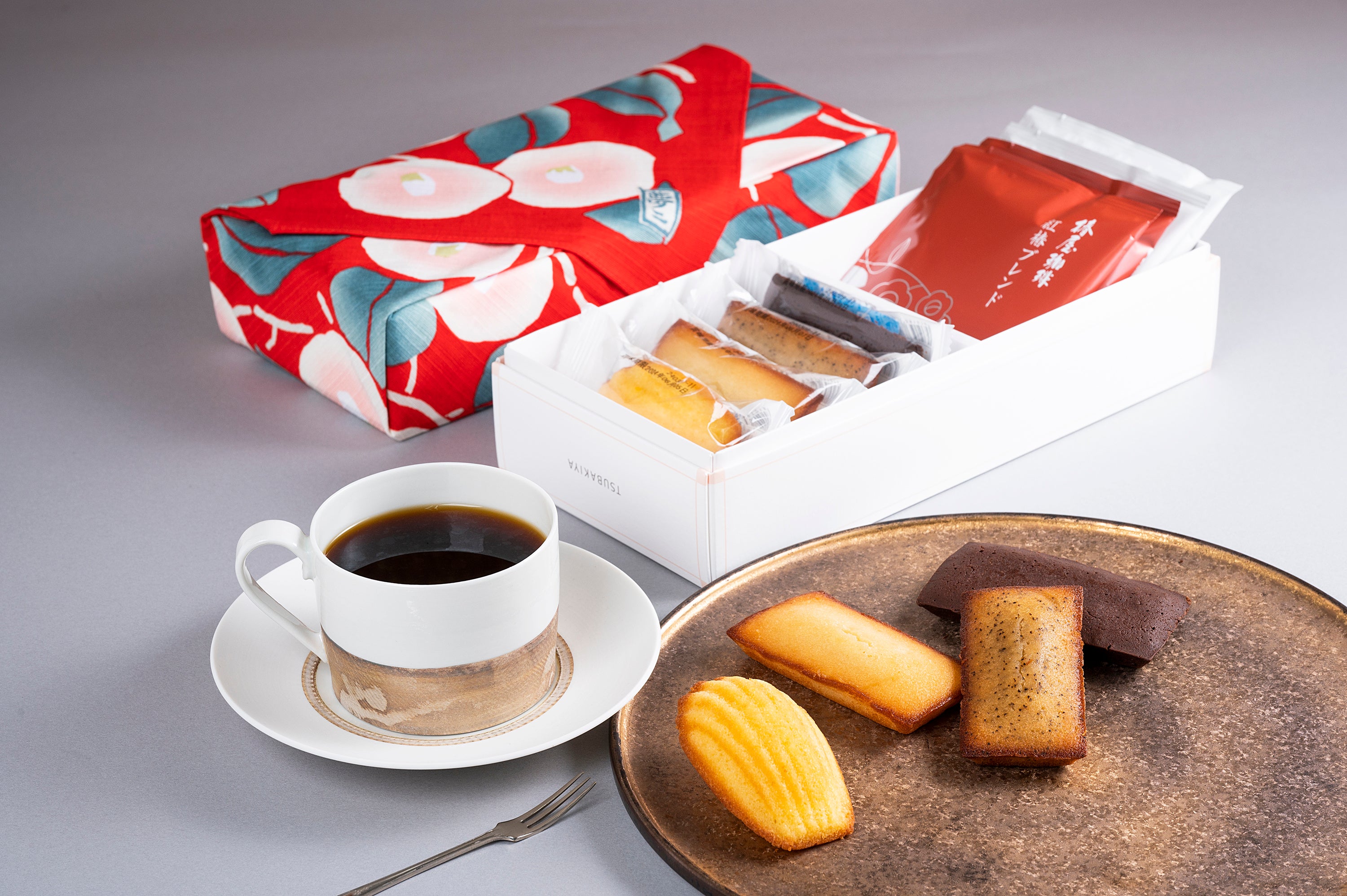 大正ロマン画家「竹久夢二」がデザインした、レトロな椿をあしらった風呂敷にお包みした商品は、「椿屋珈琲」ならではの人気のギフトです。