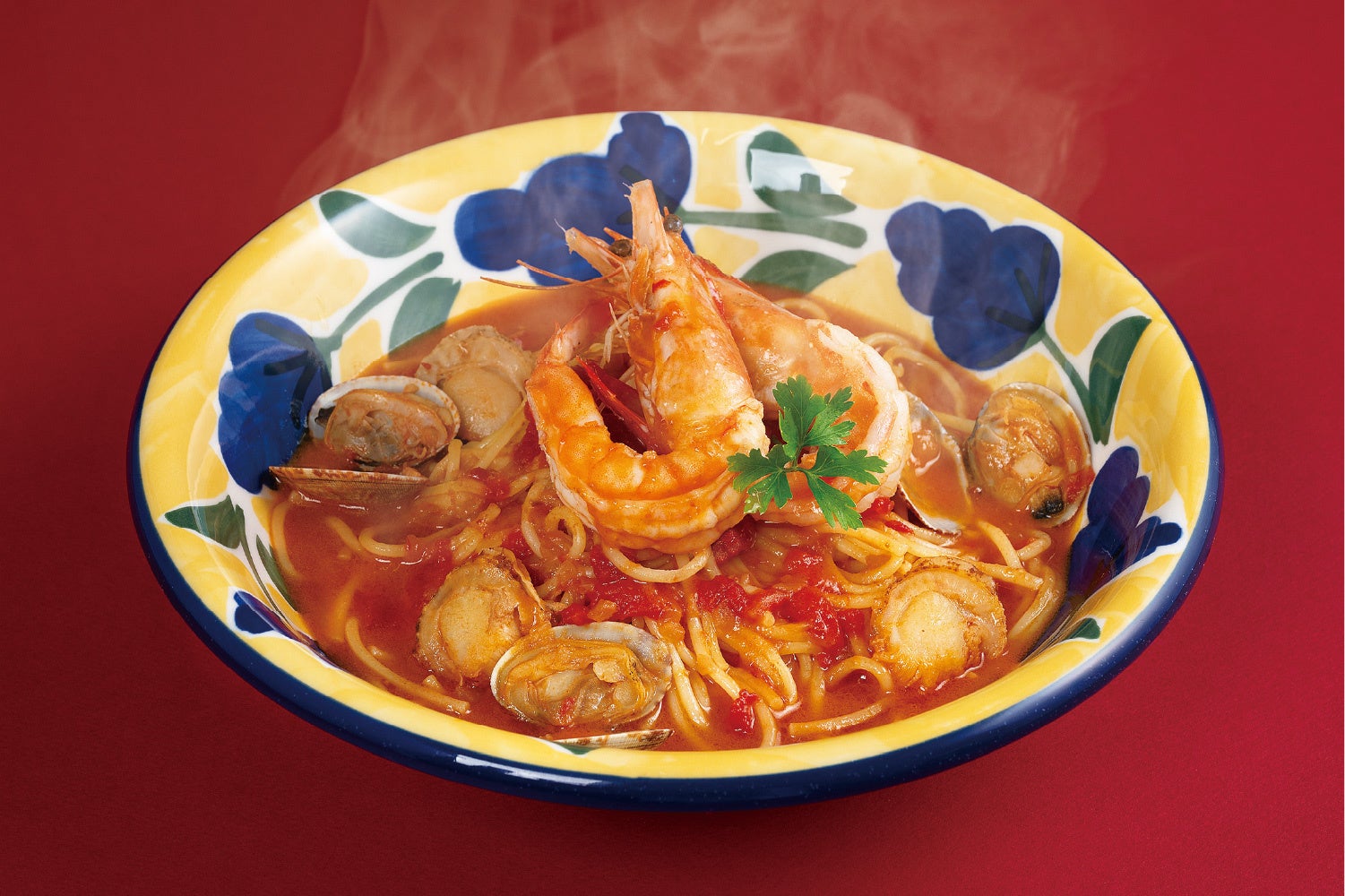 オマール風味のトマトスープに、えびや帆立、あさりを惜しみなく盛り込みました。