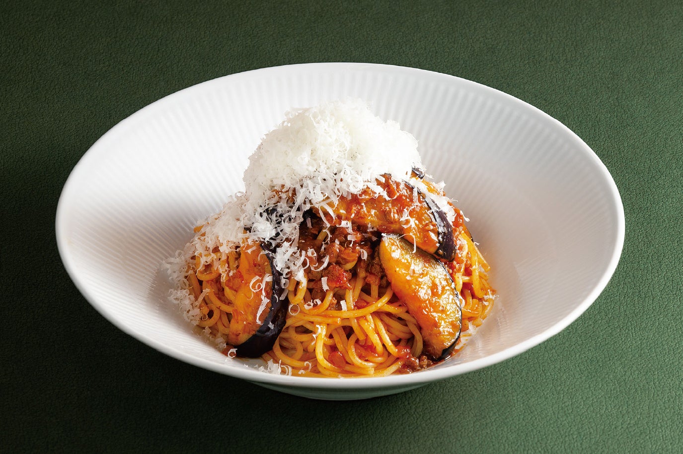 絶品ミートソースとみずみずしいなすのパスタ。ふんわり粉雪のようなイタリア産パルミジャーノチーズをたっぷりかけることで、香りとコクがさらにアップします。