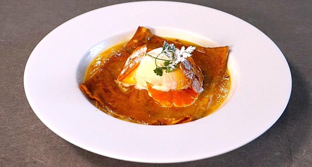 地元和歌山・中野農園(エコファーマー認定)の有田みかんを使った特製ソースを、香ばしいクレープとバニラアイスにたっぷりかけた贅沢な一皿。みかんの爽やかな酸味とバニラのまろやかさが溶け合う、冬限定の華やかなデザートです。