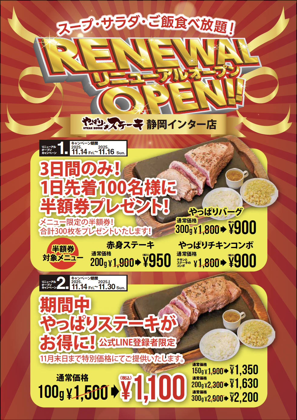 このたび「やっぱりステーキ静岡インター店」は、内装工事に伴う休業期間を経て、