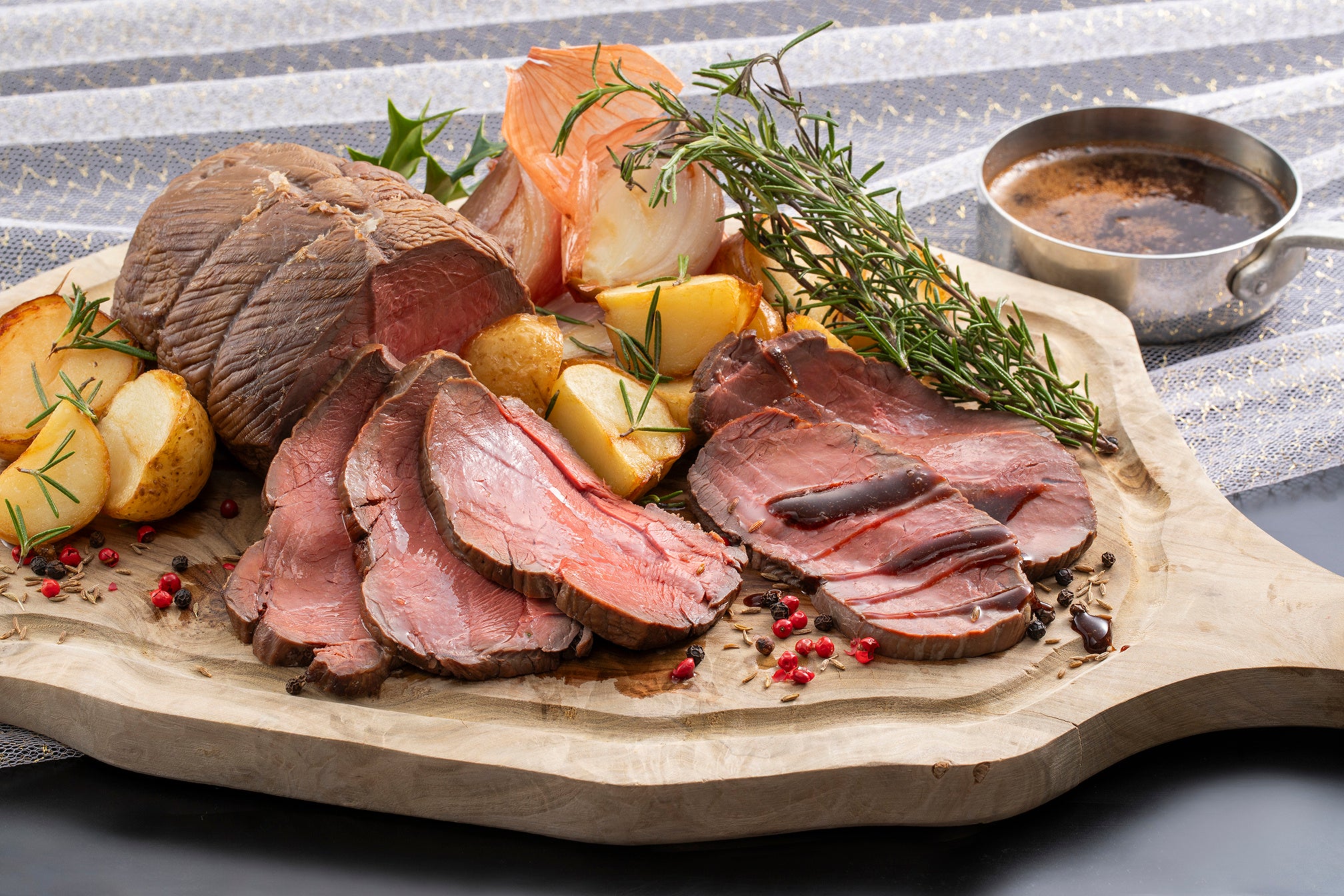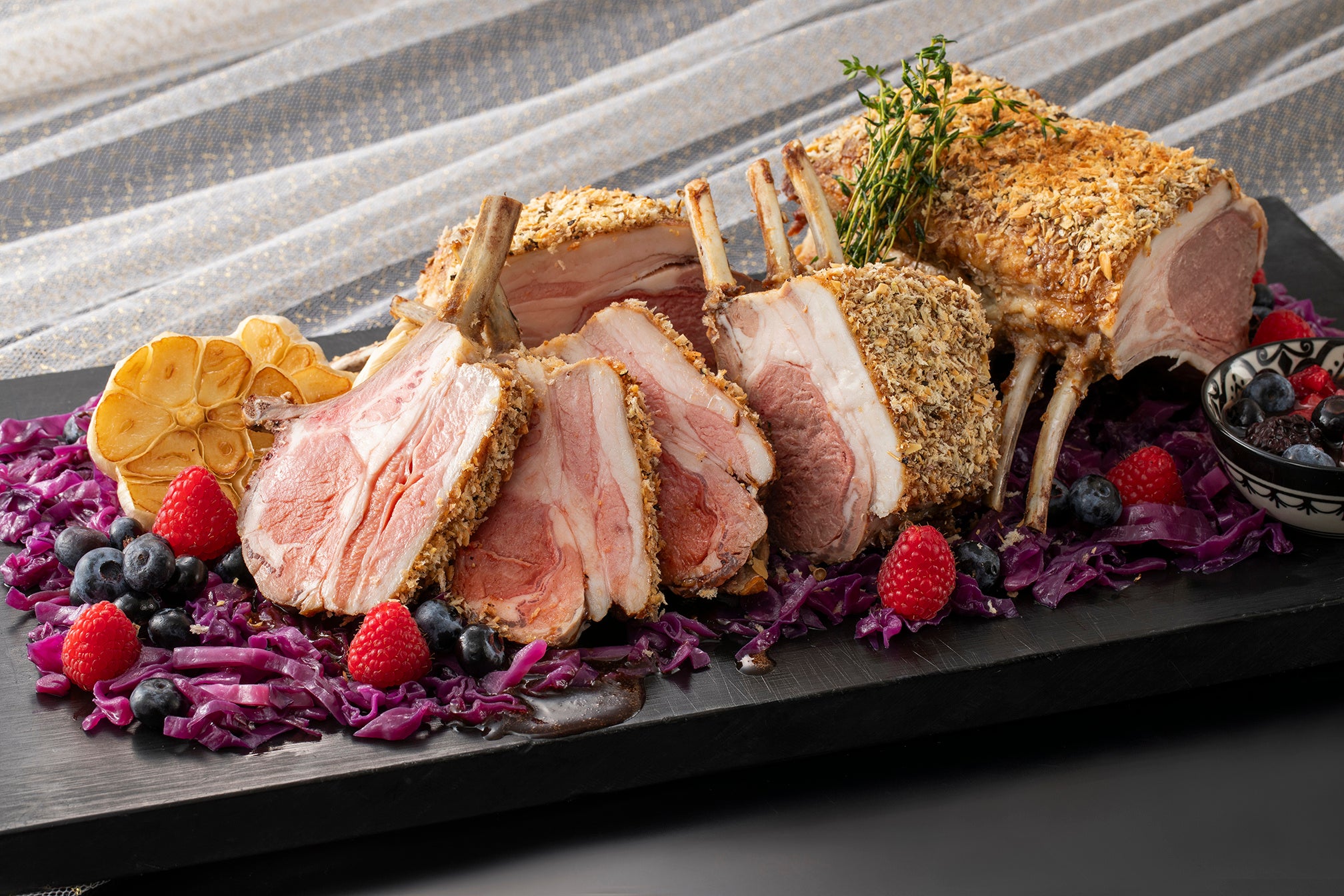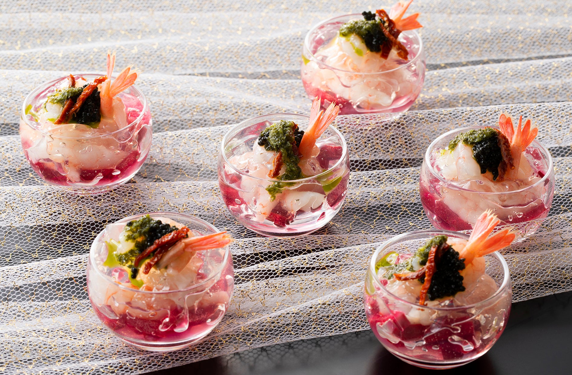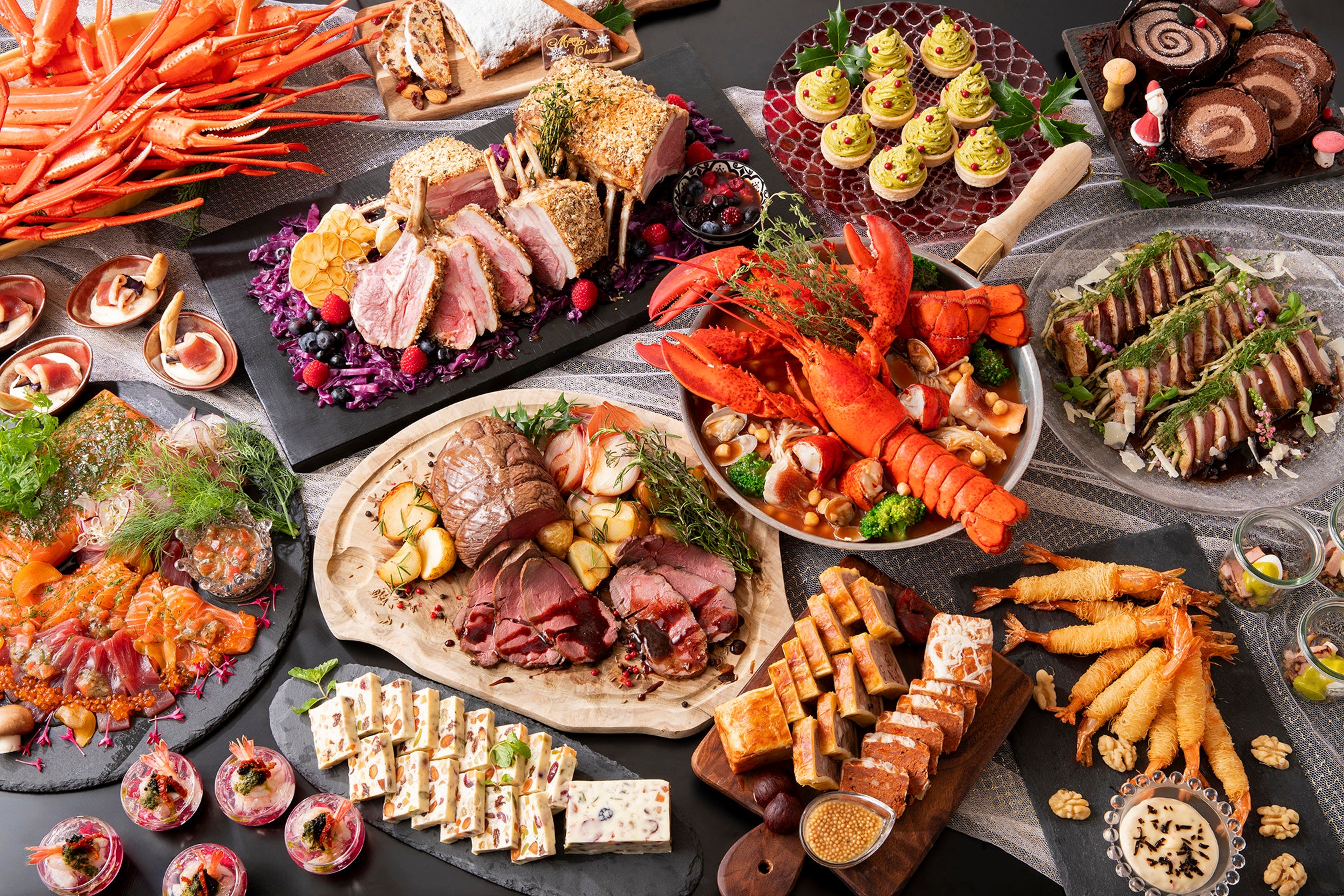 本ブッフェでは、オマール海老・キャビア・ボイルズワイガニなど、クリスマスにふさわしい贅を尽くした食材を使用したメニューをご用意しました。国産黒毛和牛を使用した「ローストビーフ&フィレ肉のステーキ」や、昆布の旨味とキャビアのコクが調和した「甘エビのマリネ キャビアと昆布ゼリーで仕上げて」、「オニオンマリネした 和歌山県産鹿もも肉の低温調理」など、一品一品シェフが丹念に仕上げた内容をお楽しみいただけます。