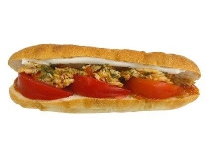 徳島県産のトマトと相性のいいローストチキントマトソースと合わせてバケッドに サンドしました。トマトの酸味とローストチキンのジューシーな旨味が口いっぱいに広がります。