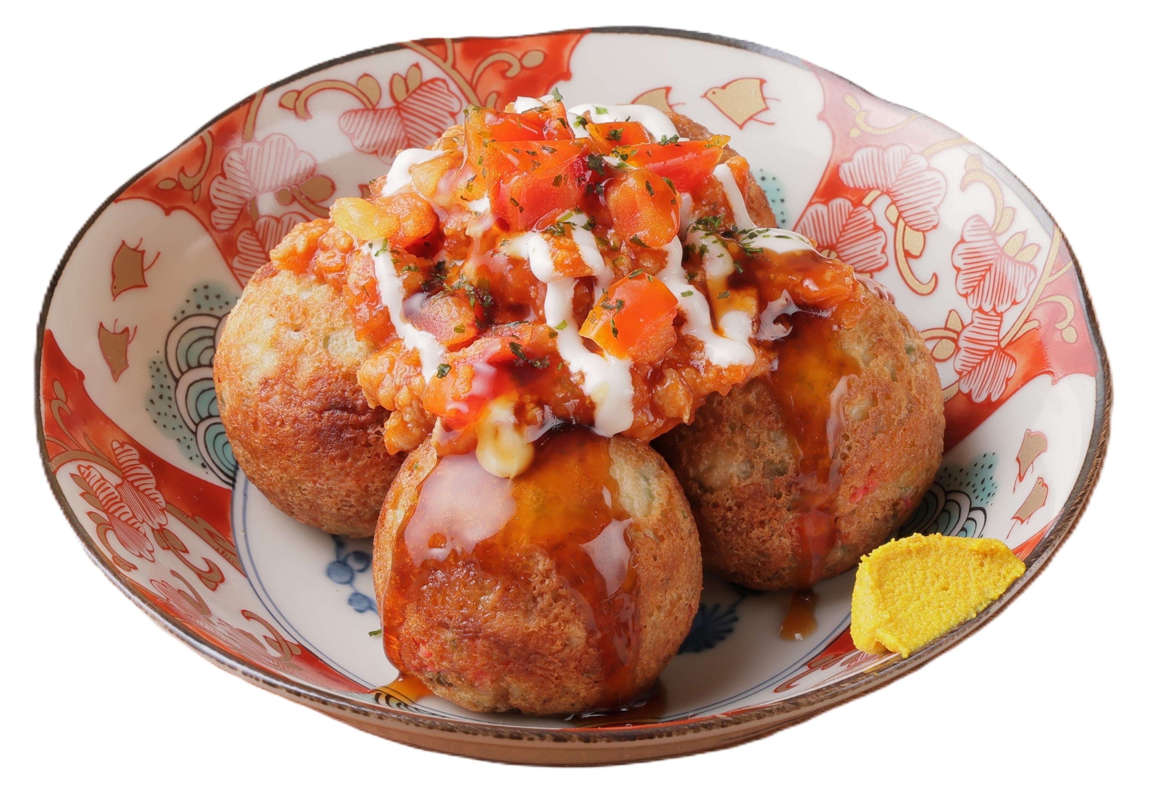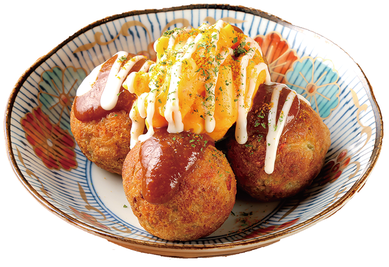 フレッシュトマトとミートソースを合わせ、てりやきソースとチーズソースをかけた、和洋折衷のたこ焼。つけ合わせの “からし” をつけるとピリッと味が締まり、濃厚な中にもキレのある味わいに!