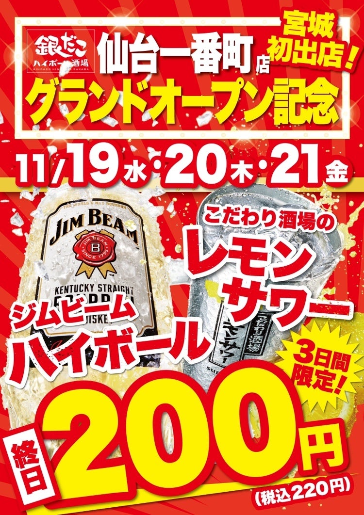 さらに、『銀だこハイボール酒場 仙台一番町店』では、オープンを記念して、11月19日(水)・20日(木)21日(金)の3日間 、銀だこハイボール酒場 仙台一番町店限定 で、グランドオープンキャンペーンを実施いたします!