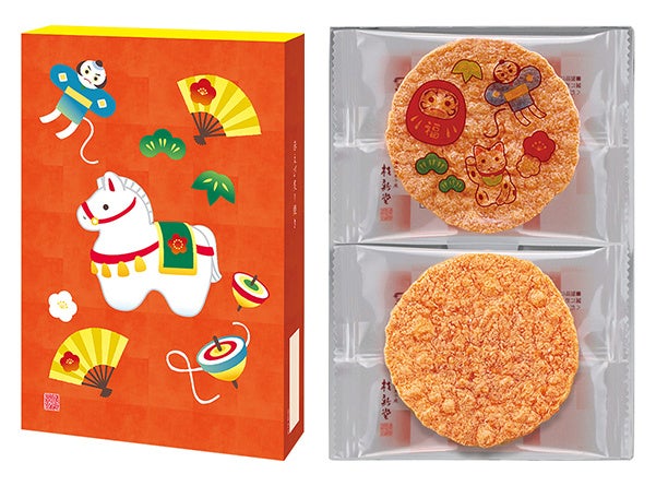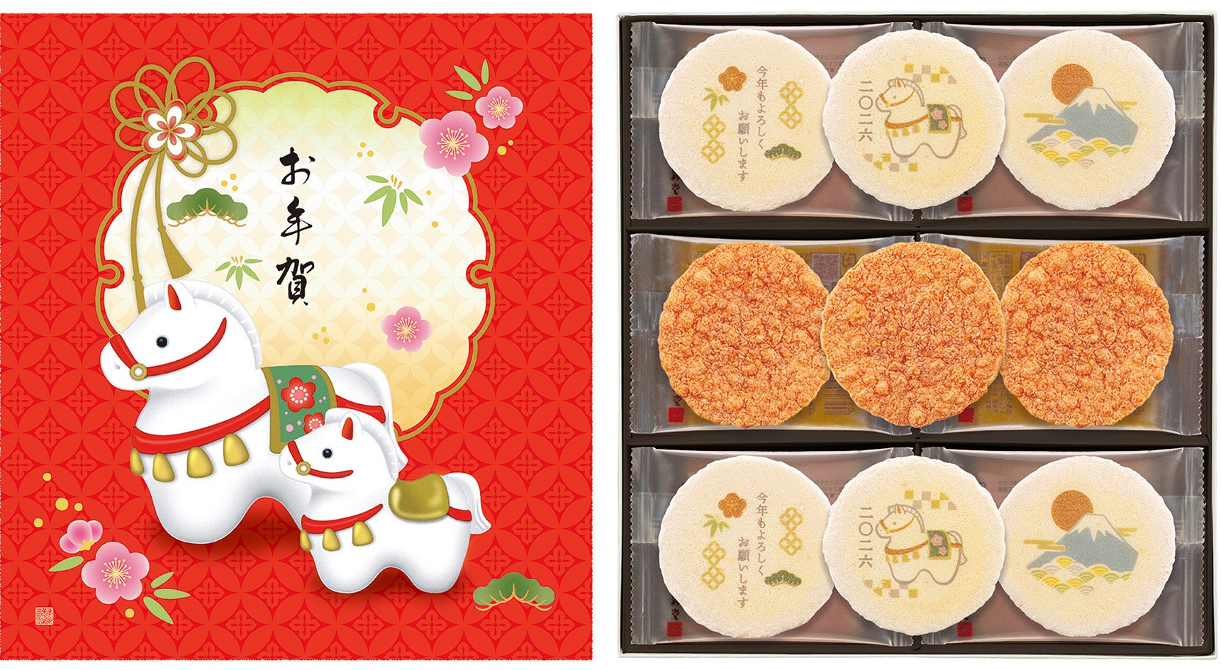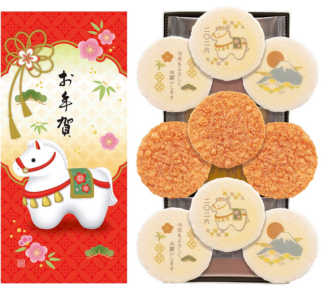 2026年の干支「午(馬)」や、「富士山と初日の出」「松竹梅」など、お正月を華やかに彩る縁起の良い絵柄を描いたえびせんべいと、えびの濃厚な旨みが楽しめる「赤えび炙り焼き」を詰め合わせた、華やかでおめでたい毎年人気のお品です。