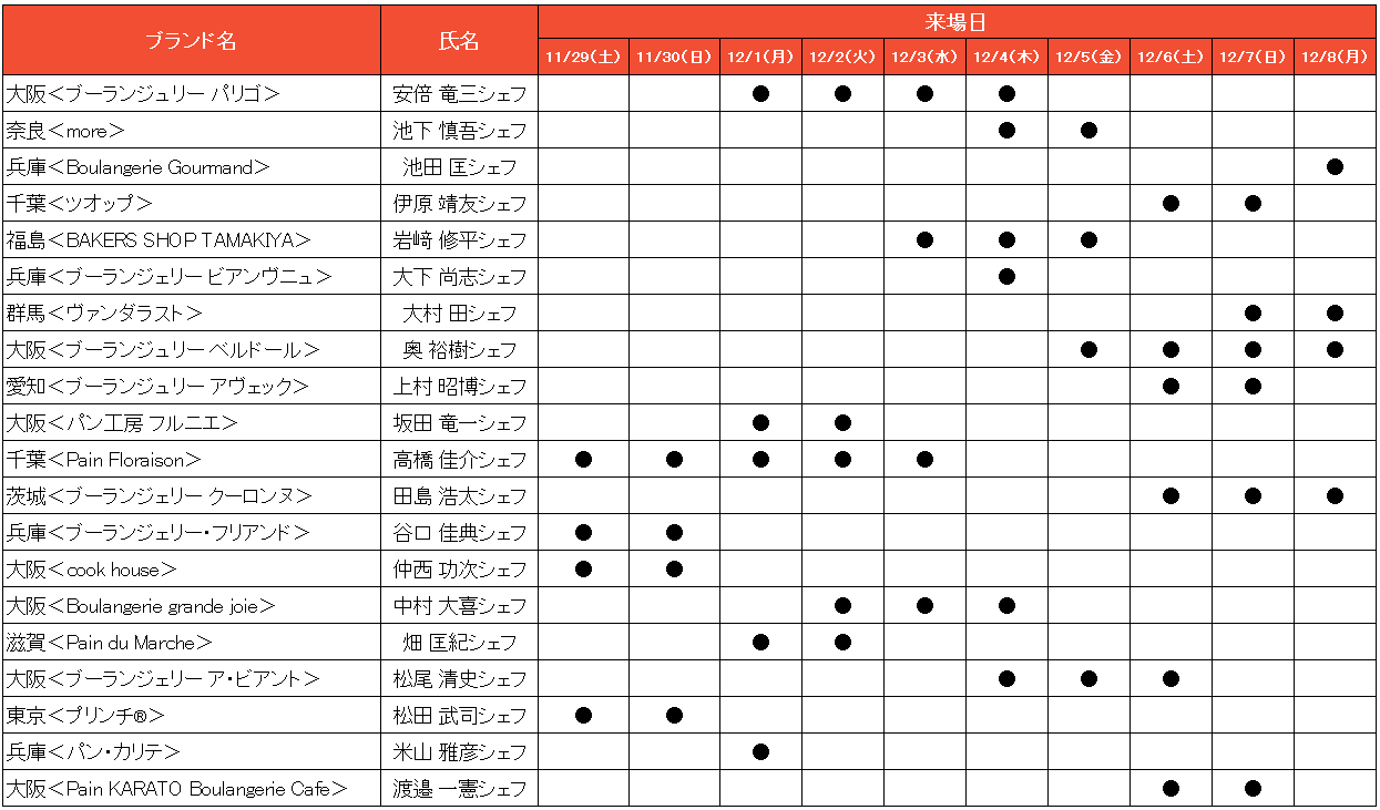 会場内の「シェフズブース」では、大阪で大人気の<ブーランジュリー パリゴ>の安倍 竜三シェフを筆頭に、全国各地から10日間で20名のシェフが日替わりで来場し、会場でこだわりのパンを焼き上げます。登場するシェフが数日ごとに入れ替わるため、いつ訪れても新たなパンとの出会いや、異なるシェフの技術を何度でもお楽しみいただけます。