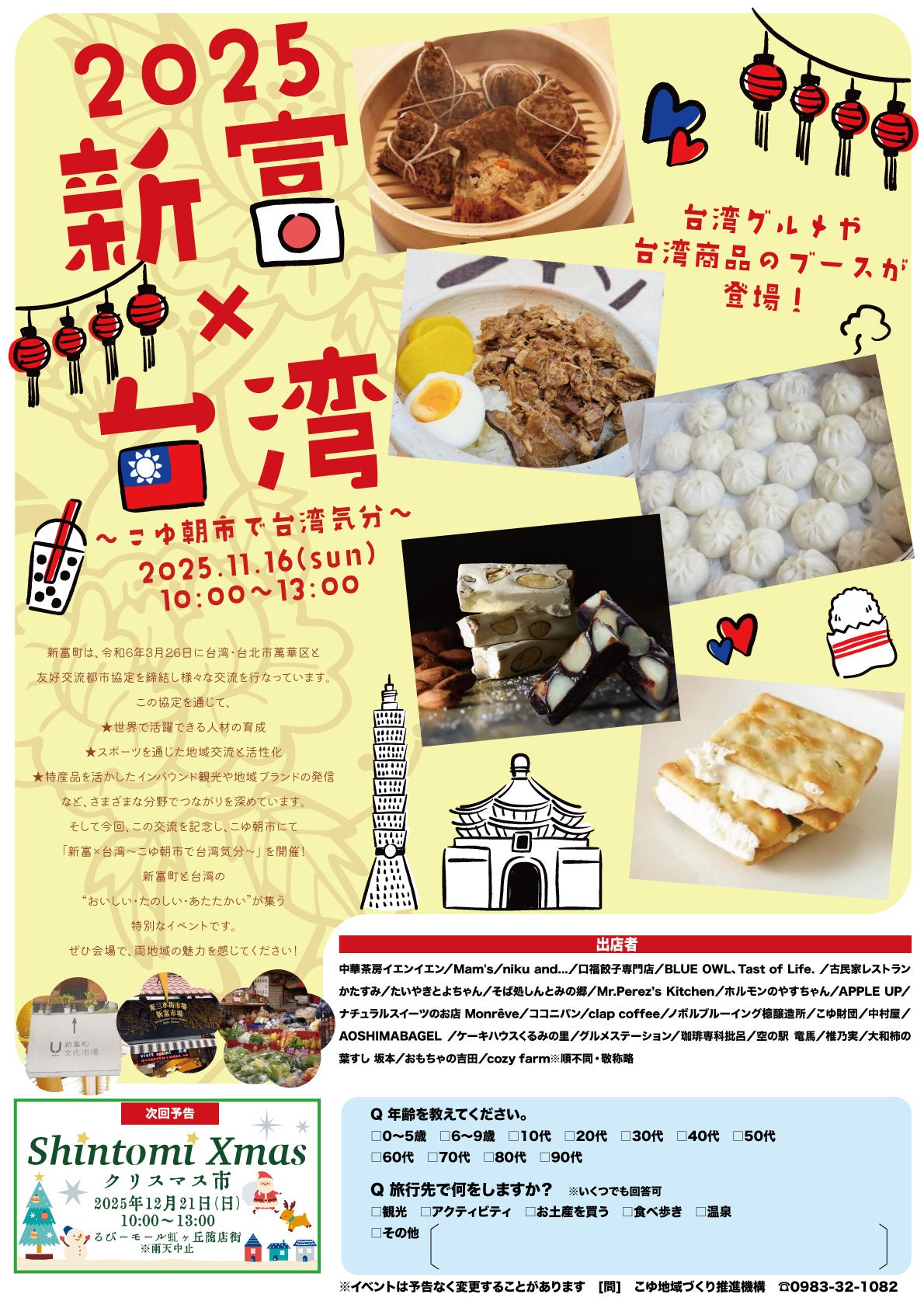 2025年11月16日(日)10:00~13:00、宮崎県新富町「こゆ朝市」にて、台湾の魅力を体感できる特別イベント「新富×台湾〜こゆ朝市で台湾気分〜」を開催いたします。