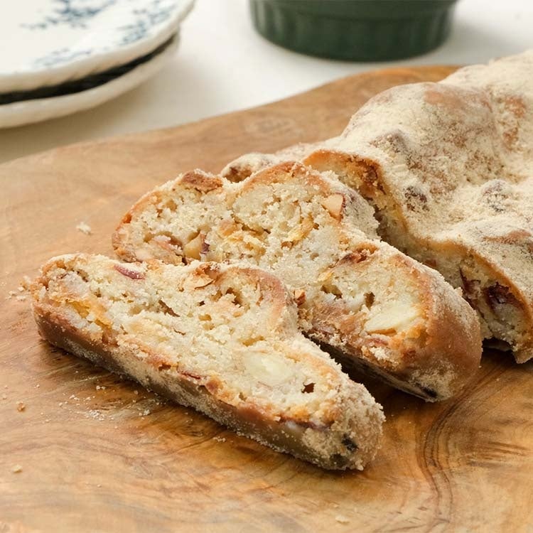 シュトーレンは、酵母生地にナッツやフルーツを練り込んで焼き上げ、粉砂糖をまぶしたドイツ発祥の菓子。クリスマスまでの期間、毎日少しずつ切り分けて味わう習慣で知られています。