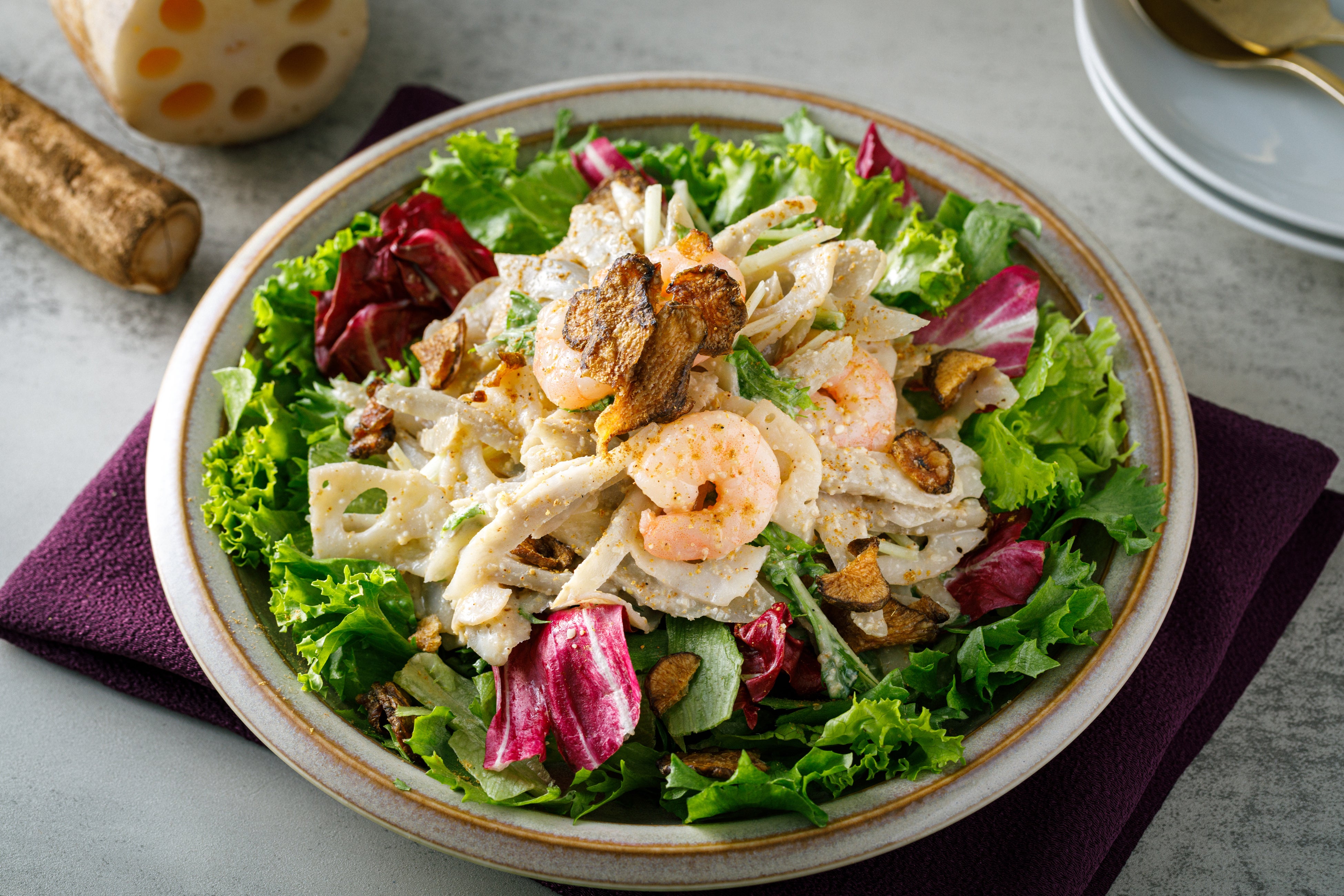 和田さんが丹精込めて育てた風味豊かなごぼうに、シャキシャキのれんこんとプリッとした海老を合わせました。味の決め手は、山椒が奥ゆかしく香る特製ごまマヨドレッシング。仕上げの菊芋チップスの香ばしさが、全体の食感と風味を一層引き立てます。