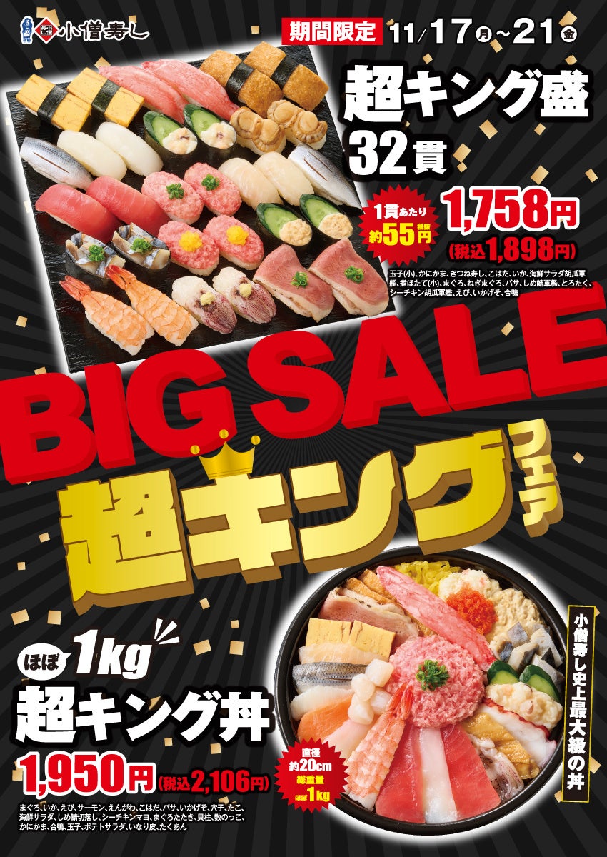 KOZOホールディングス株式会社の子会社である株式会社小僧寿しは、持ち帰りすし店「小僧寿し」にて、2025年11月17日(月)~21日(金)の期間限定で「BIG SALE『超キング』フェア」を開催します。※店舗により未実施の場合がございます。